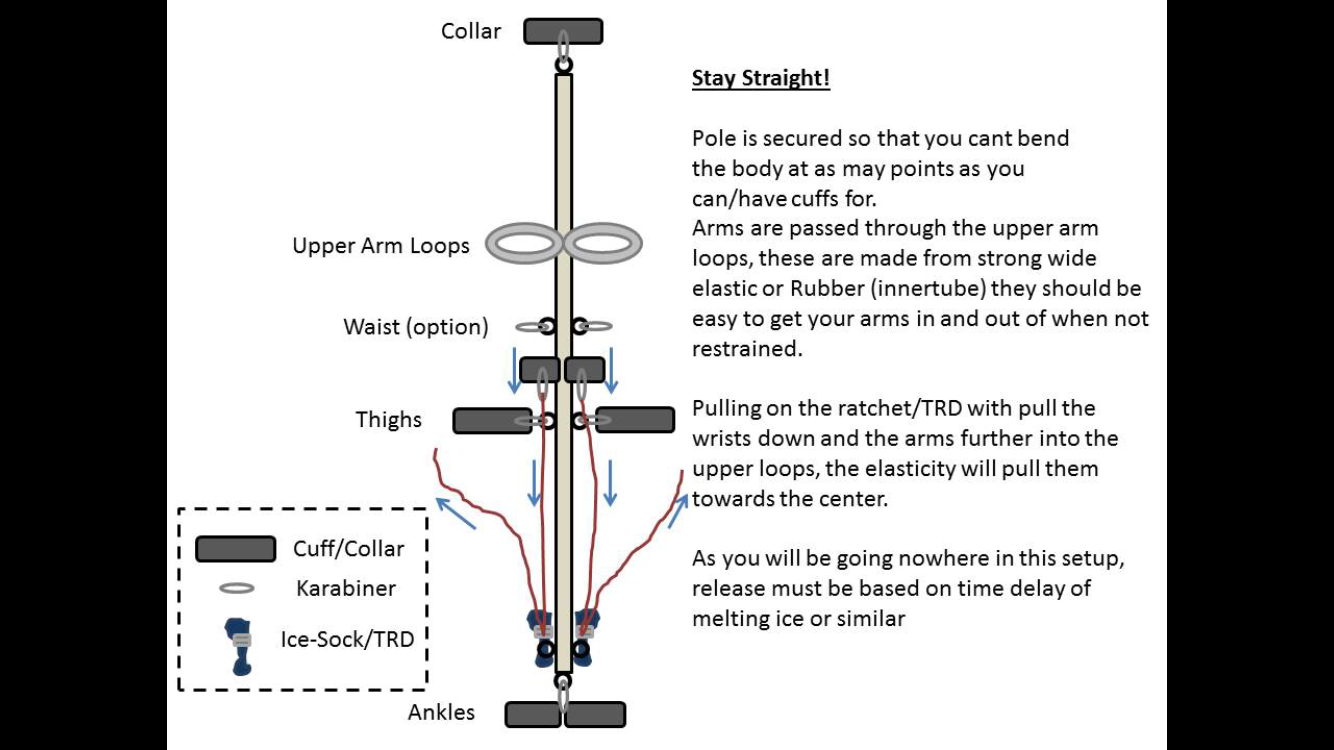 (26 Jun 2016, 07:42 )ltxrob Wrote: pass arms though the 'hoops' and connect wrist cuffs to ropes that go to TRD/ratchets/etc secured by the ice cube sock to points near the ankles.