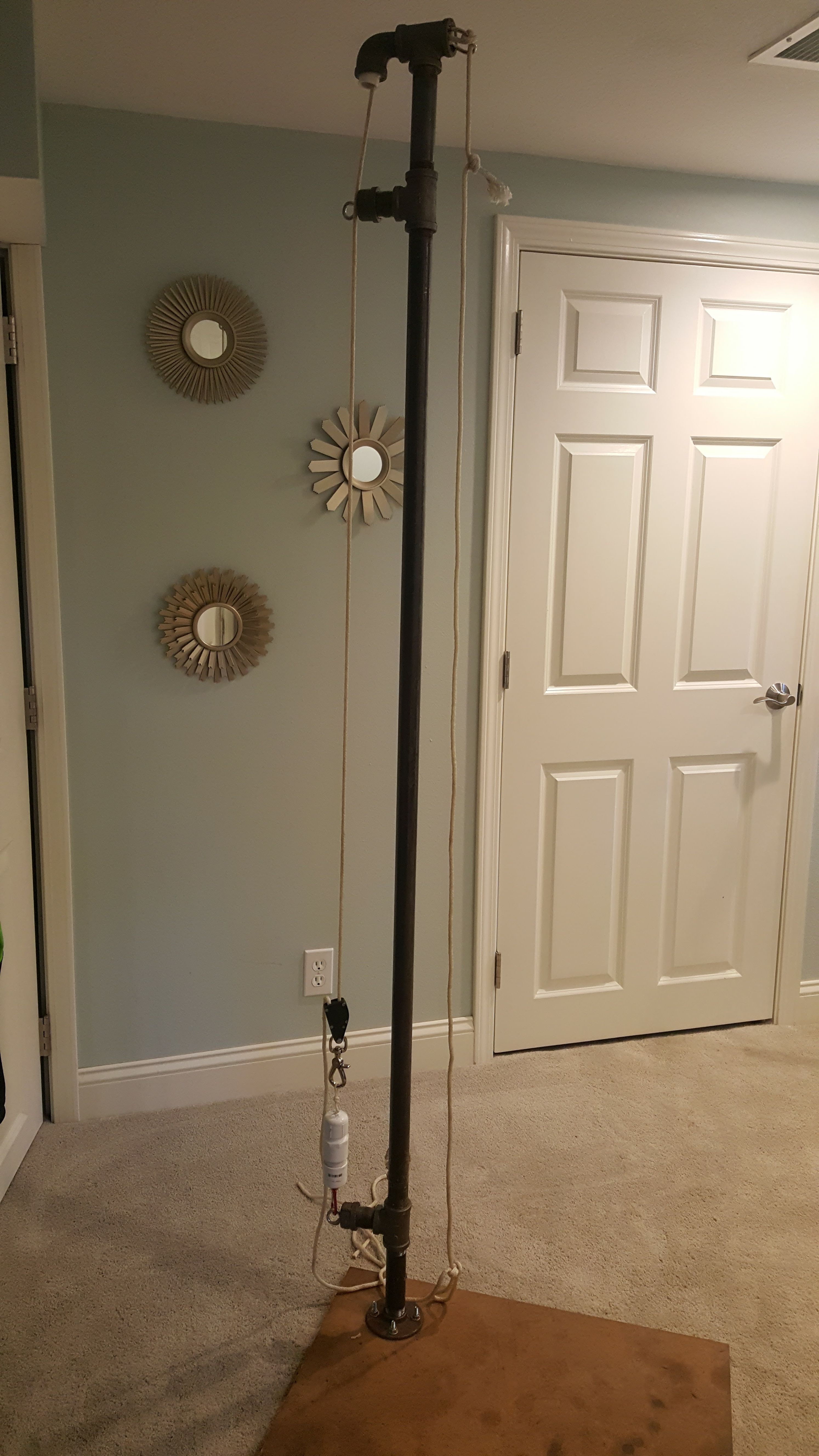 Very ingenious use of plumbing supplies - that's why I love a hardware shop as well! Just a couple of things occur: What is your board made of? The bolts look OK and the pipe anchor also looks strong - but I was wondering if the board would stand up to a sideways angular torque (say if you lost your balance and leaned one way or other) resulting in the board splintering and the pipe falling - you with it! Unless you are also securing the pipe at the top, so it is supported and you can struggle to your heart's content. Also, is a cinch loop a good idea if your arms are raised for 1-1.5 hours? Circulation might be a problem - leather cuffs or lowered arms might be better for first test. I love these ideas, but, myself, I am terrified of time locks of any kind, Ice, electric, clockwork etc etc. I'm very happy to be able to get out of bondage when I want to. Maybe I'm just not doing it right! Good luck with your apparatus and have fun.
