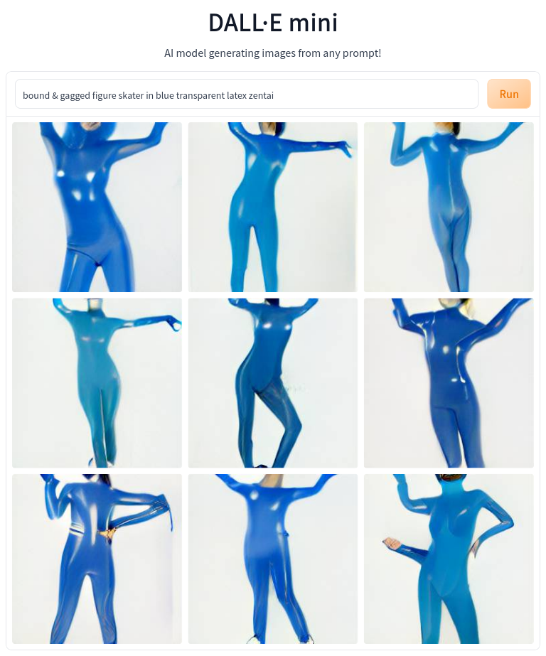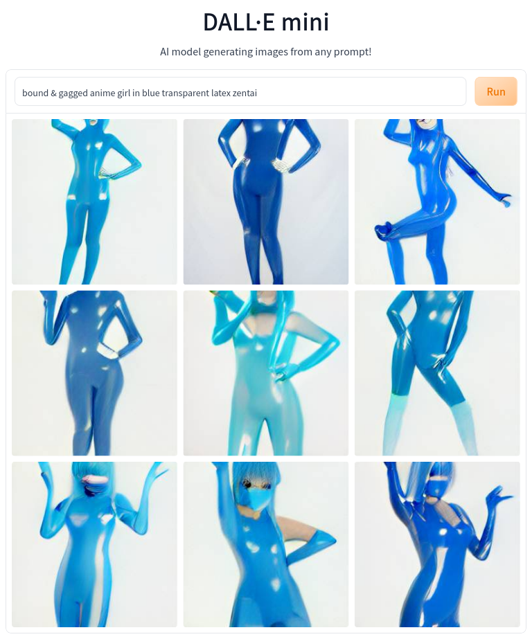 DALL-E perfectly understands what blue latex is, that zentai is a kind of a catsuit with gloves and a hood, anime girls have big heads and big eyes, and that catsuits are usually worn by real women. It totally does not understand the "bound" concept, just a bit about mask-like gags.