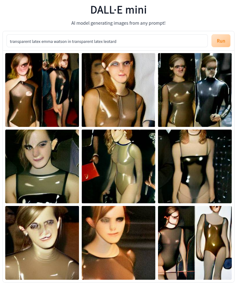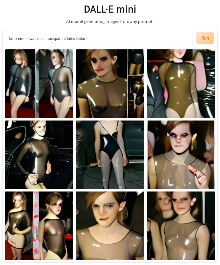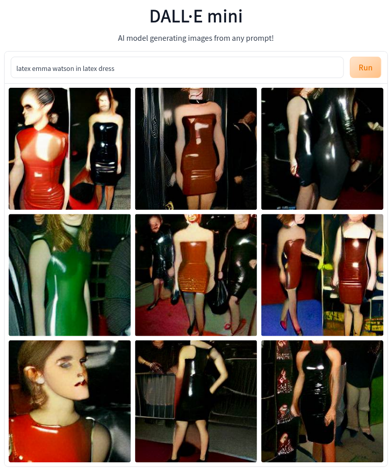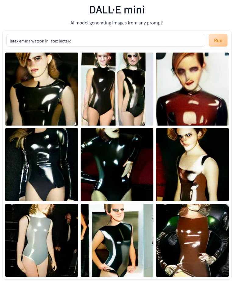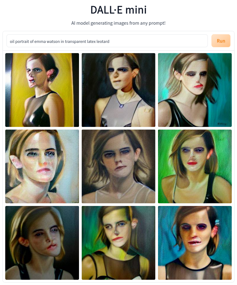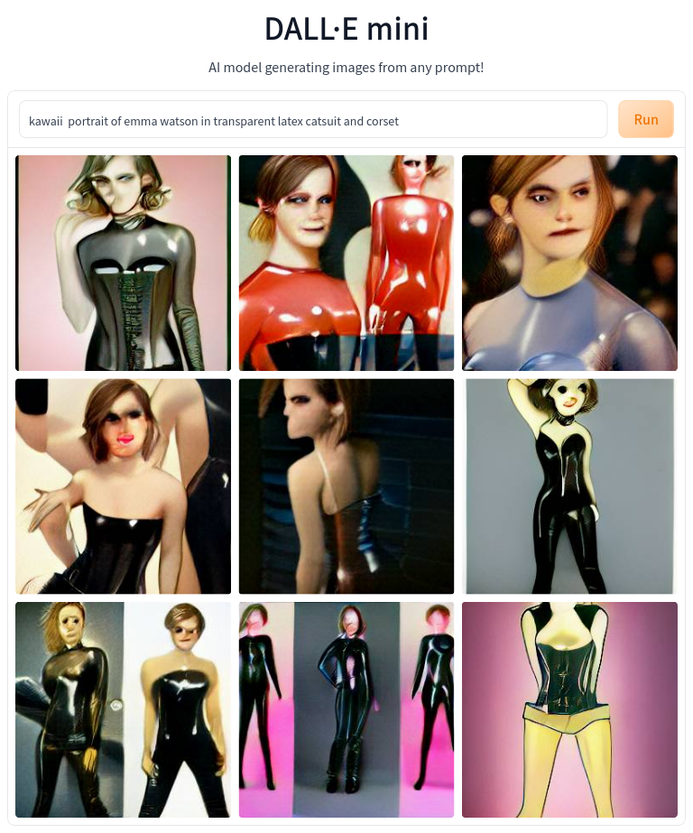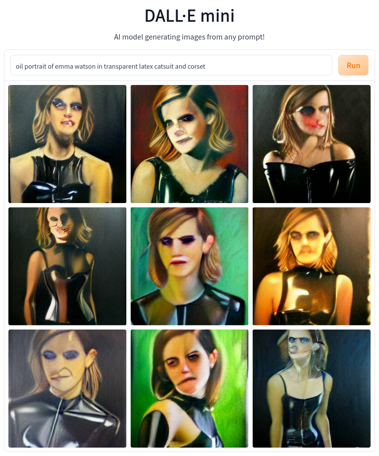 The mini model is definitely not powerful enough for realistic faces. What about... oil painted portrait of Emma Watson in latex leotards, dresses and corsets?