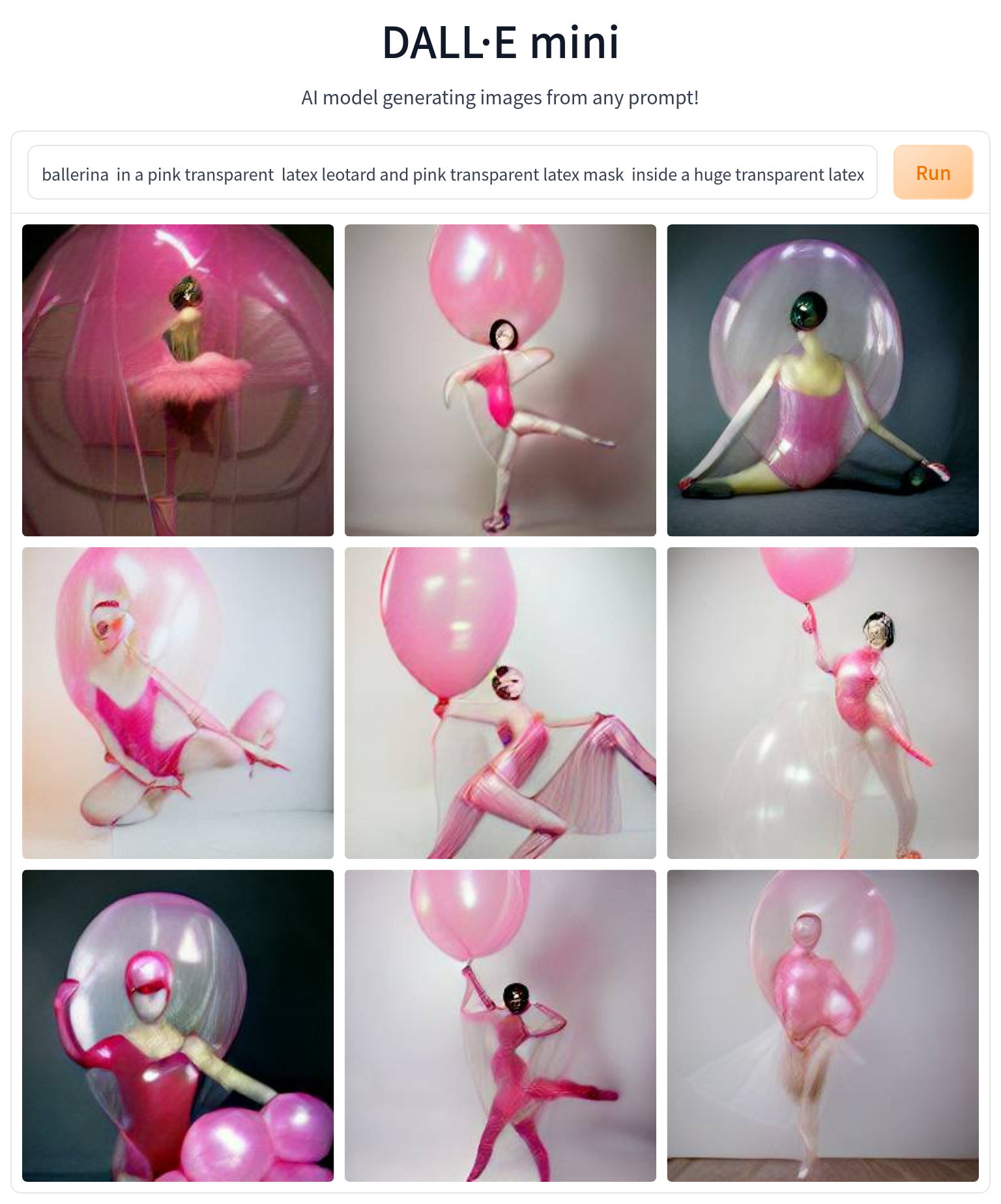 ballerina  in a pink transparent  latex leotard and pink transparent latex mask  inside a huge transparent latex balloon
