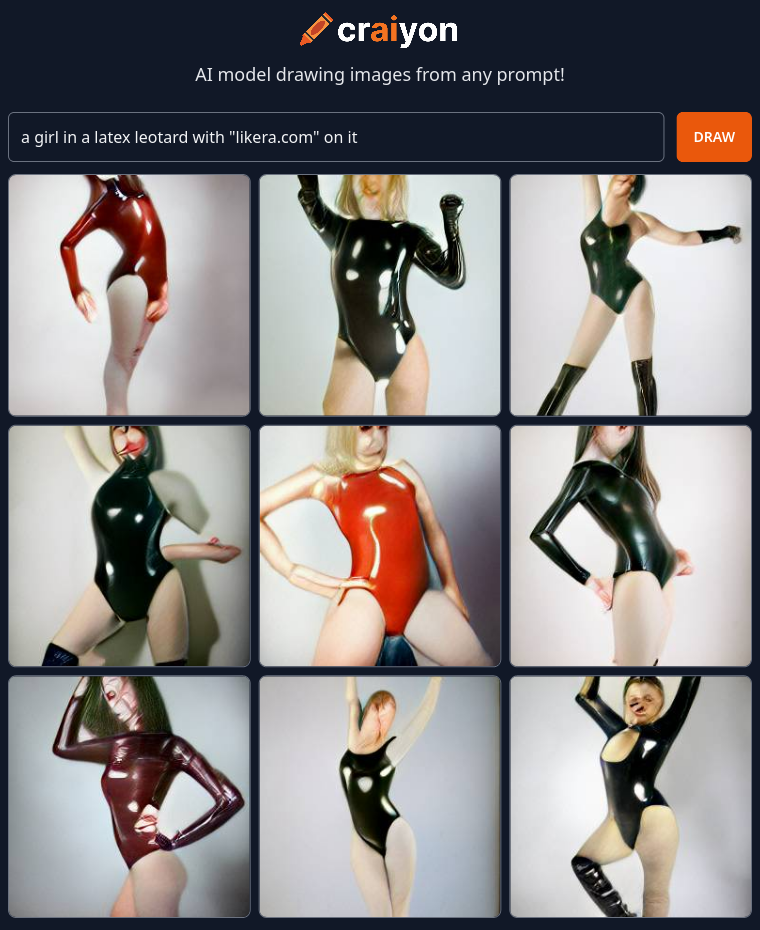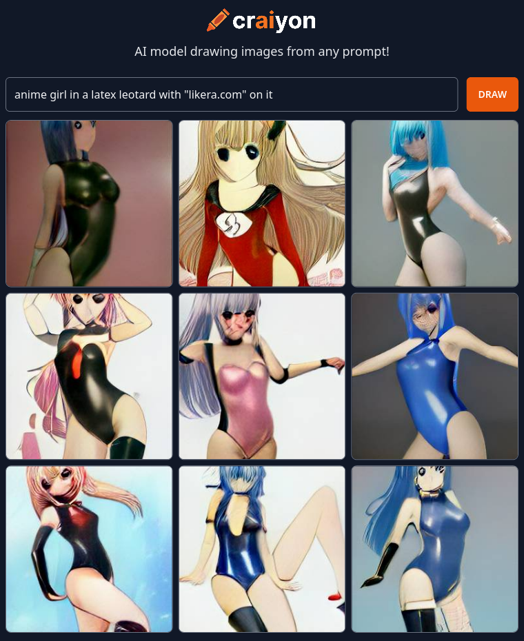 (29 Jun 2022, 14:12 )Like Ra Wrote: This is what I could get for "a girl in a latex leotard with "likera.com" on it" (and an anime version of it):