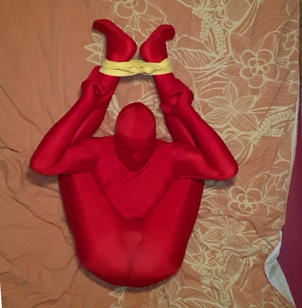 Some thoughts. - This pose is called "Yoganidrasana" or yogic sleep pose (https://en.wikipedia.org/wiki/Yoganidrasana) - Another name for it is Pashinee/Pashini/Pasini Mudra, what can be translated as "bound by the noose" (see where I'm going?) - The psychological benefits of this mudra are to release from the unconscious animal conditioning that is being afraid of locked up or chained up. - This boy looked like me (actually, the resemblance is quite ... stunning ...) when I was ~14-16 (my ears are not pierced yet, though) - At this age I was able to do autofellatio in a similar pose (with a plug in my ass, of course) - I love the white stockings and white high heels - Bondage is pretty much obvious here. How else? Do practice yoga! And especially this pose!