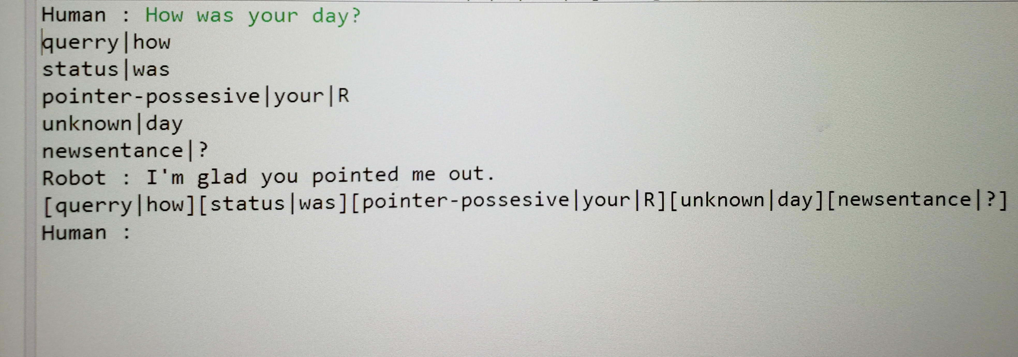 Anyways here is a photo I took of one of its responses. The green text is my input., the "Robot: I'm glad you pointed me out." Is a failed response because it didn't recognize the word day and thus interpreted the question as how was your.