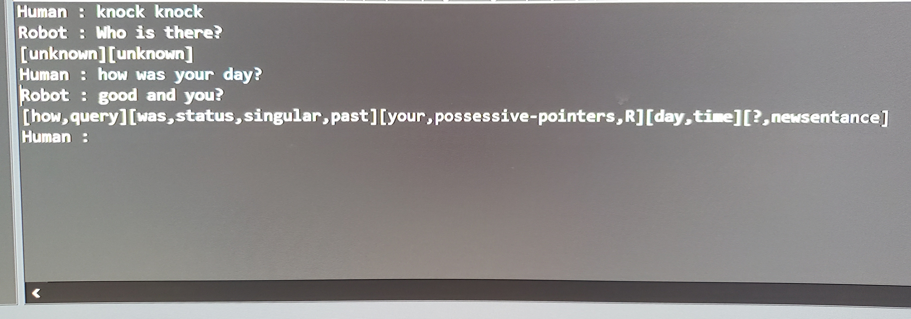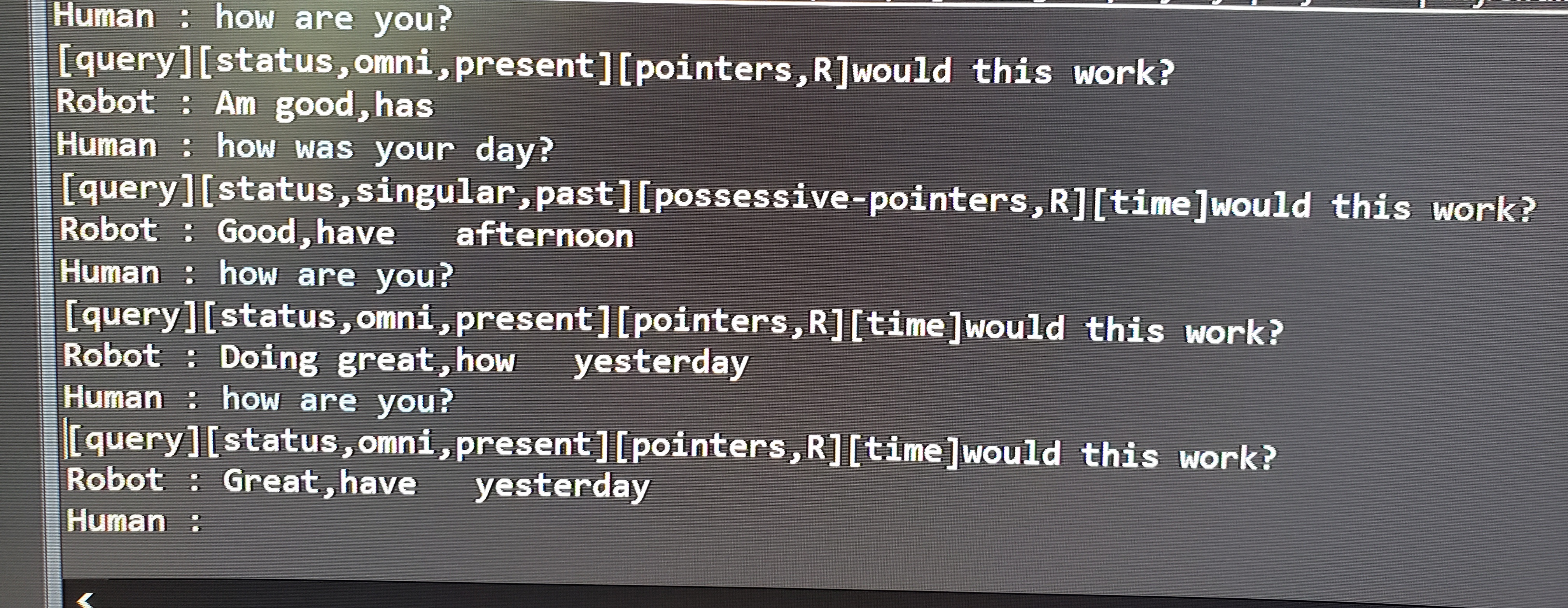 Edit 1: Final entry for today but it is now sounding far more sane if nothing else. It has a proper backbone of speech dissection but I haven't loaded enough data to make it a decent conversationalist. It needs a lot of sentence structure templates and I need to fix multi sentence and comma problems form csv files.  Afterwards I hope to start work on the response generator which could hopefully cobble together randomized responses to make the speech less stale. In the longer run I hope to have it harvest some data from what you say to make its responses more grounded and relevant. I have added a photo of a conversation with it. Fairly stale since it only reacts to what you say and has very few speech templates with responses pre written by me, max is not a real person, it is just a test to see if the code for determining gender by name worked.