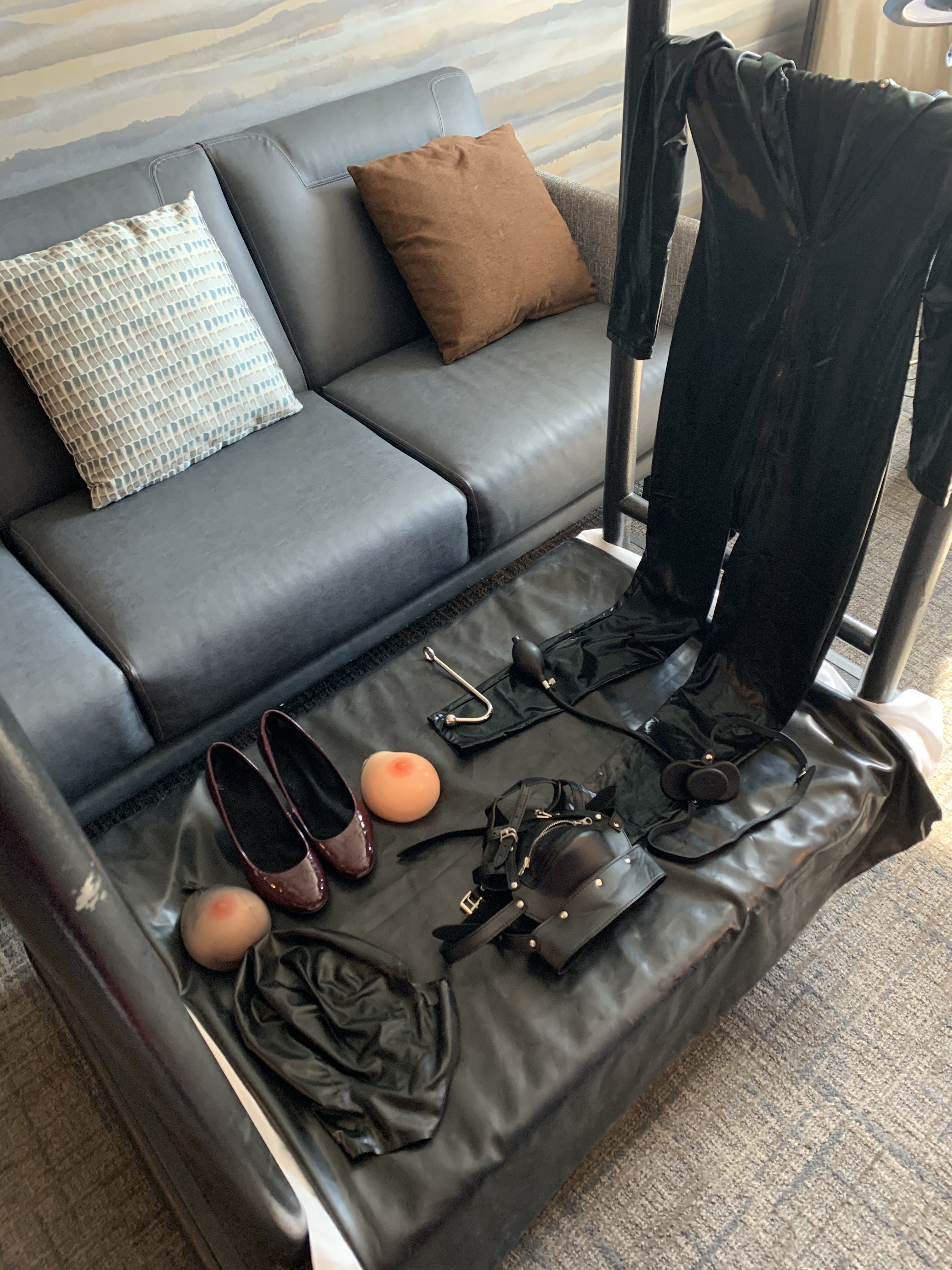 Hello everyone! So I’ve never thought about joining a site for this kind of stuff, but what a perfect day to do it! I’m planning on going big tonight and if you look at my photos, you can see I have a lot to work with, but I’m trying to make this the best session yet! So what does everyone think?? I’m the photo of all the items, the one on the far left is a positioning lanyard, so basically I can pull up any weight I want (me) and release it just as easy. But there’s really no set plan, I was hoping you all could take a look and give me a nice, tight, and punishable night 😉. The second photo is the outfit I’ll be wearing. Full body suit, heels (if I find black ones when I run out before tonight then I’ll get them) anal hook , fake boobs, then I have. Latex hood that covers my eyes (not sure what you all think) but also an inflatable gag with a lock ring (or should I buy a regular ball gag? I’m going to the sex store so please let me know!!) and then finally a leather hood that will zip any gag shut and also can be suspended or whatever else. Now look at all the stuff I have and tell me what you think I should do!! I’m a little more strict. I don’t like to move that much. The thing I need help with the most is a time release. All I have now is I could put ice in stockings, but if I see time locks at the sex store, I’ll get them. If you see anything else that would help while I’m out, just shoot me a message. Oh and I’m doing a red rope chest/boob/ whatever harness. Let me know what one would be best, especially for maybe so light suspension 😏 ANYWAYS! I’m so happy to be on this site and I pray this is what I’ve been looking for! Hit me up everyone! Give me your worst 😈