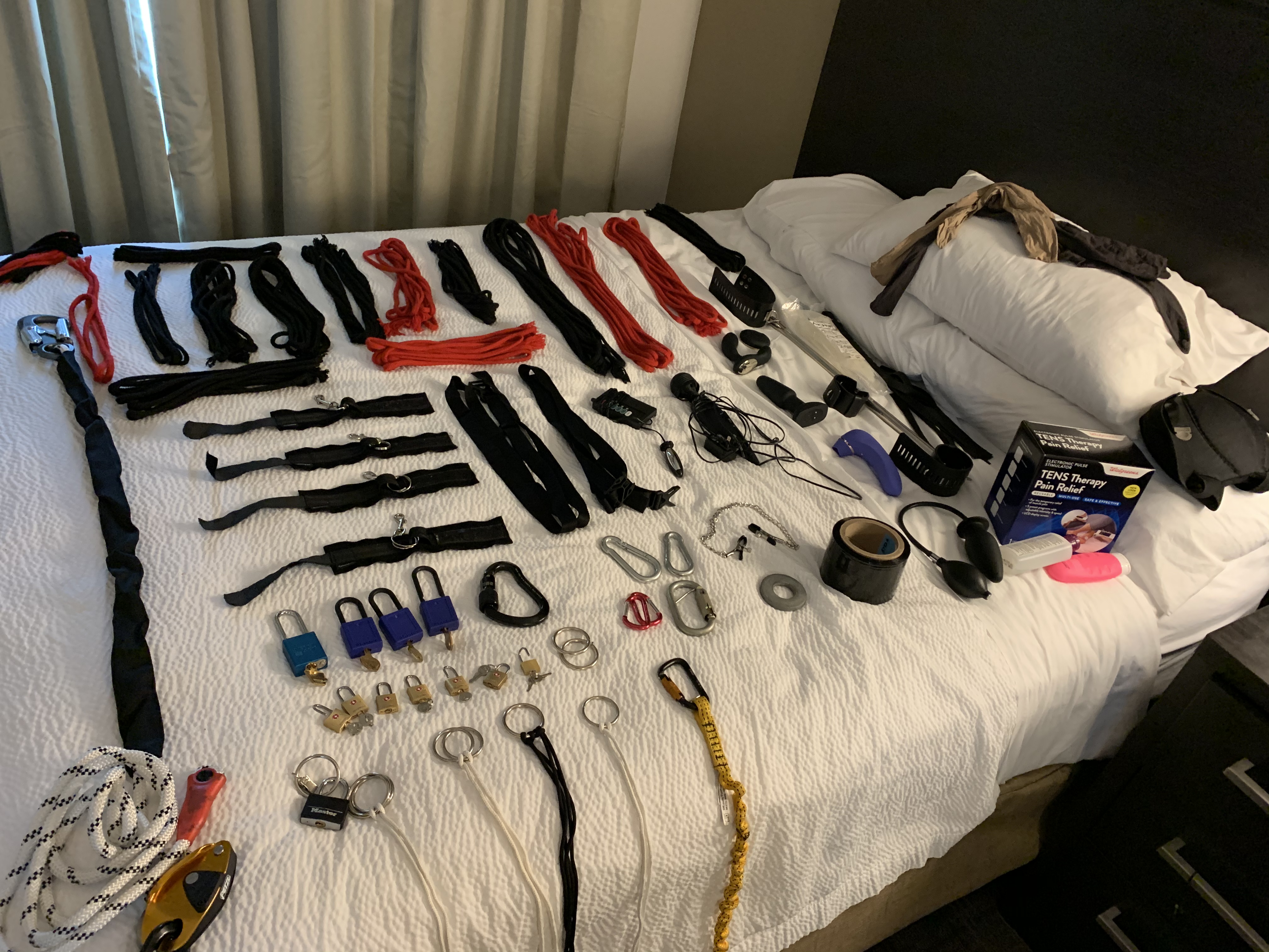 Hello everyone! So I’ve never thought about joining a site for this kind of stuff, but what a perfect day to do it! I’m planning on going big tonight and if you look at my photos, you can see I have a lot to work with, but I’m trying to make this the best session yet! So what does everyone think?? I’m the photo of all the items, the one on the far left is a positioning lanyard, so basically I can pull up any weight I want (me) and release it just as easy. But there’s really no set plan, I was hoping you all could take a look and give me a nice, tight, and punishable night 😉. The second photo is the outfit I’ll be wearing. Full body suit, heels (if I find black ones when I run out before tonight then I’ll get them) anal hook , fake boobs, then I have. Latex hood that covers my eyes (not sure what you all think) but also an inflatable gag with a lock ring (or should I buy a regular ball gag? I’m going to the sex store so please let me know!!) and then finally a leather hood that will zip any gag shut and also can be suspended or whatever else. Now look at all the stuff I have and tell me what you think I should do!! I’m a little more strict. I don’t like to move that much. The thing I need help with the most is a time release. All I have now is I could put ice in stockings, but if I see time locks at the sex store, I’ll get them. If you see anything else that would help while I’m out, just shoot me a message. Oh and I’m doing a red rope chest/boob/ whatever harness. Let me know what one would be best, especially for maybe so light suspension 😏 ANYWAYS! I’m so happy to be on this site and I pray this is what I’ve been looking for! Hit me up everyone! Give me your worst 😈