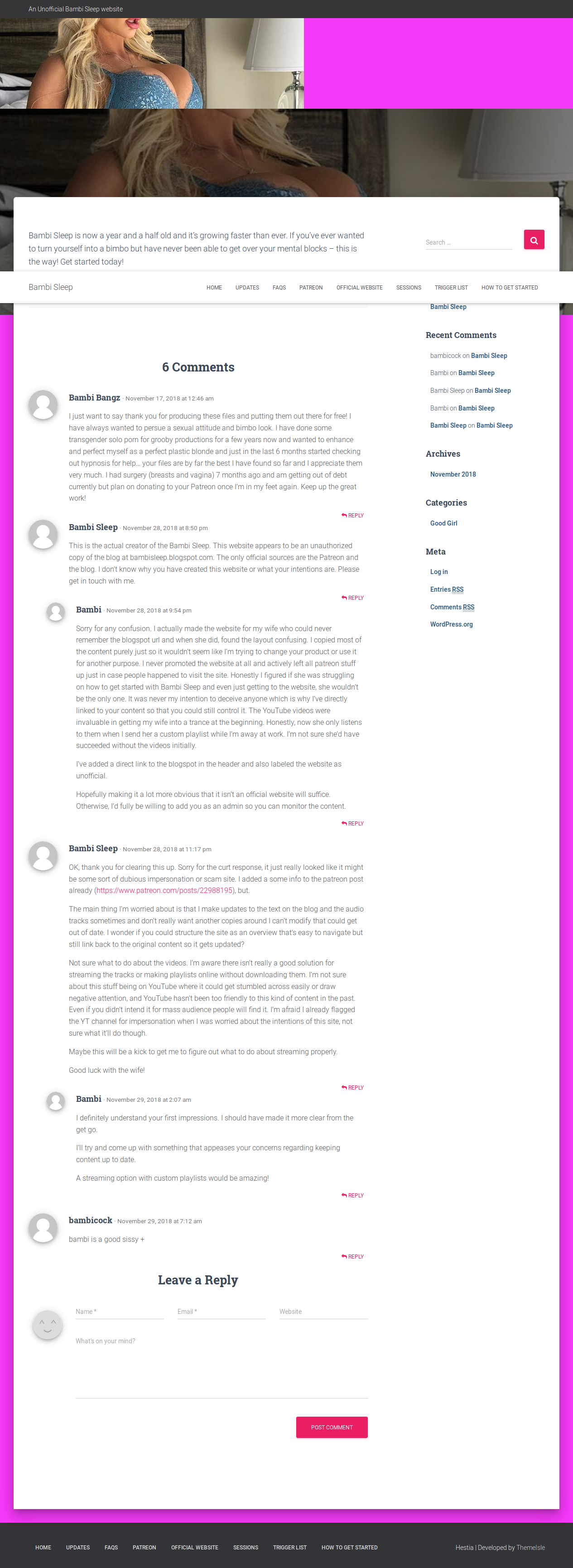 Quote:Sorry for any confusion. I actually made the website for my wife who could never remember the blogspot url and when she did, found the layout confusing. I copied most of the content purely just so it wouldn’t seem like I’m trying to change your product or use it for another purpose. I never promoted the website at all and actively left all patreon stuff up just in case people happened to visit the site. Honestly I figured if she was struggling on how to get started with Bambi Sleep and even just getting to the website, she wouldn’t be the only one. It was never my intention to deceive anyone which is why I’ve directly linked to your content so that you could still control it. The YouTube videos were invaluable in getting my wife into a trance at the beginning. Honestly, now she only listens to them when I send her a custom playlist while I’m away at work. I’m not sure she’d have succeeded without the videos initially.