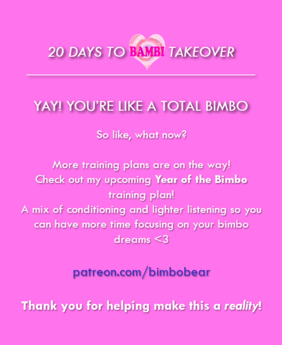 hypnodouble Wrote:This might sound like an overly broad and unhelpful answer, but Bambi can be whatever you want it to be. These files are effective as hell, but it's important to remember that all hypnosis is self-hypnosis. You are interpreting and processing the suggestions in a way that makes sense for you, and you have the power to change your perspectives on those suggestions.