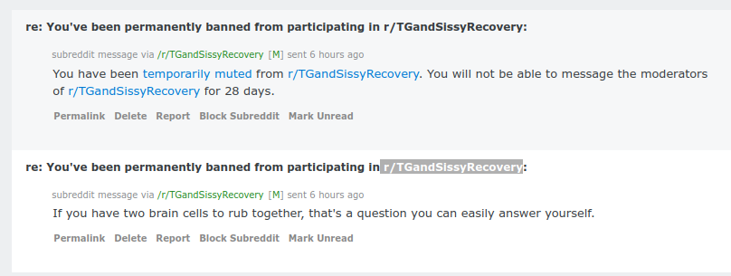 r/TGandSissyRecovery Wrote:You have been temporarily muted from r/TGandSissyRecovery. You will not be able to message the moderators of r/TGandSissyRecovery for 28 days.