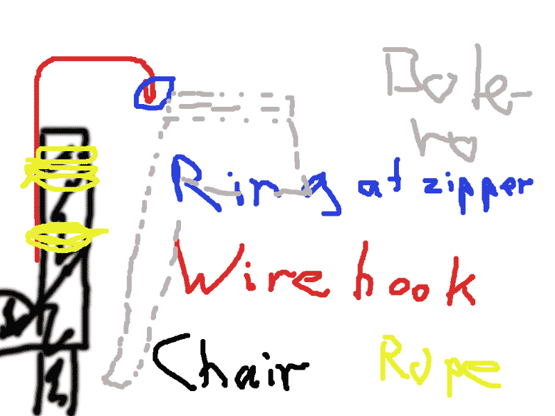 Once the zipper is getting lower, the ring can slide down and it will be caught by the extra bend in the hook. I tried, it works well. But the setup is not stable, the chair can fall, I have to find a better stand for the hook. In the end, I would like to find a stand, where I can put the hook while bound - after it dropped down from the ice lock. But first things first, I need to find a more stable stand, perhaps a bit higher even. I have a drawer a bit below chest height, this might be good. And I have a vague idea about fixing the hook there too. This is definitely a bad project for Sunday night, this is the last step for today.