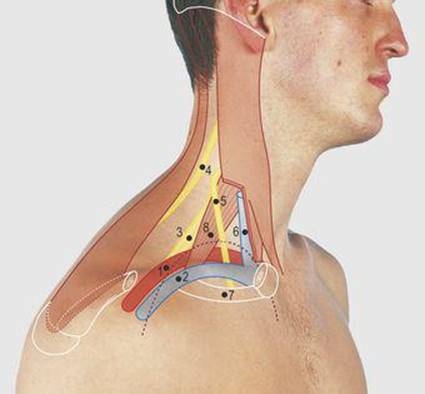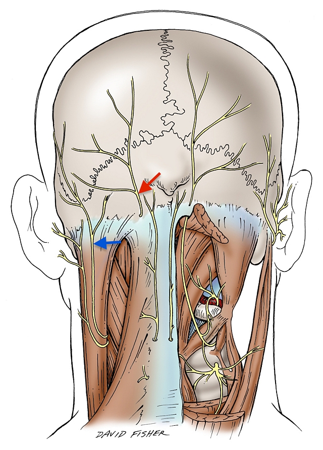 To be especially clear any damage to these nerves would be very serious, even fatal, and any purposeful attempt to compress them is just plain stupid. If you are dumb enough to misuse this information it is your own fault. You knew where not to exert pressure. Most important below is 5, the phrenic nerve. It innervates the diaphragm and without it you can’t breath. It runs over the anterior scalene muscle which is hidden just behind the sternocleidomastoid muscle (not numbered below, but is over the structure labeled 6). Compression of this nerve is to be avoided. 3 is the brachial plexus. This is a network of nerves originating from spinal segments C5 to T1. This innervate your shoulder, arm and hands. They are quite fragile and normally protected by a lot of fat but any pressure deep into the space shown, just in front of the trapezius muscle, would be hellishly painful and possibly result in lasting damage to the nerves. Don’t apply pressure in that space. Running with 6, in the carotid sheath, is the vagus nerve. This nerve regulates lung and heart function. If you irritate the nerve you can pass out or even die. Do not apply pressure over the jugular veins or carotid arteries. This can be fatal. The carotid sheath runs up behind the sternocleidomastoid up in the direction of the ear. At the rear of neck, where it meets the skull is a large nerve, the greater occipital nerve (red arrow) which can be compressed between two neck muscles when the head is flexed forward. Compression of this nerve can cause neck pain as well as severe headaches, like migraines, that project to the forehead and temples because of a quick in the wiring of the nervous system. Keeping the head in a forward posture, where the neck is flexed forward but the end extended to look forward can cause pain just behind and below the ears due to muscle tension in the sternocleidomastoid muscle. This can also compress the lesser occipital (blue arrow) and great auricular nerves which, again, can manifest as migraine-like headaches to the temples and forehead. I hope you can use this information to enjoy bondage for longer without sever discomfort or damage to any nerves. Surface anatomy images were mostly taken from https://doctorlib.info/anatomy/surface-a...index.html |