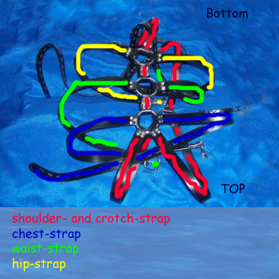 Open all buckles. Red straps first: Put the shoulder straps over your shoulders, the three o-rings should be in front. Connect the crotch strap to the strap that is hanging down from the shoulder straps on your back. Ok, this might be impossible. Alternatively, close this buckle first, then step into the ring, let the crotch strap rest at the inside of your knee and slide over the shoulders. Then the crotch strap easily goes into your crotch. Try this until you get the width right. If you think, you lack the dexterity for this, sit on a chair. I think, everybody, who is able to lace his shoes, can do this. Close the hip- (yellow) and waist (green) straps now, the chest strap (blue) too, unless you want your arms inside. If you cannot reach the buckles, you are out of luck! In order to have the chest strap include your arms, close it in front of you, then pull it over head and shoulders. A second person might be able to make it a little bit tighter, but you can get it fairly tight this way. I tried to have the chest strap over my arms but underneath the strap going down from the shoulder straps, but I didn't succeed. I hope, this helps. If you have specific questions or problems that I didn't see, let me know. If you succeed with my description, let me know too please. 😊