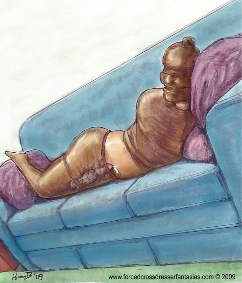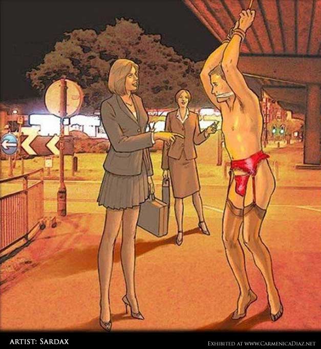 Bound men in feminine clothes and femdom fetish art