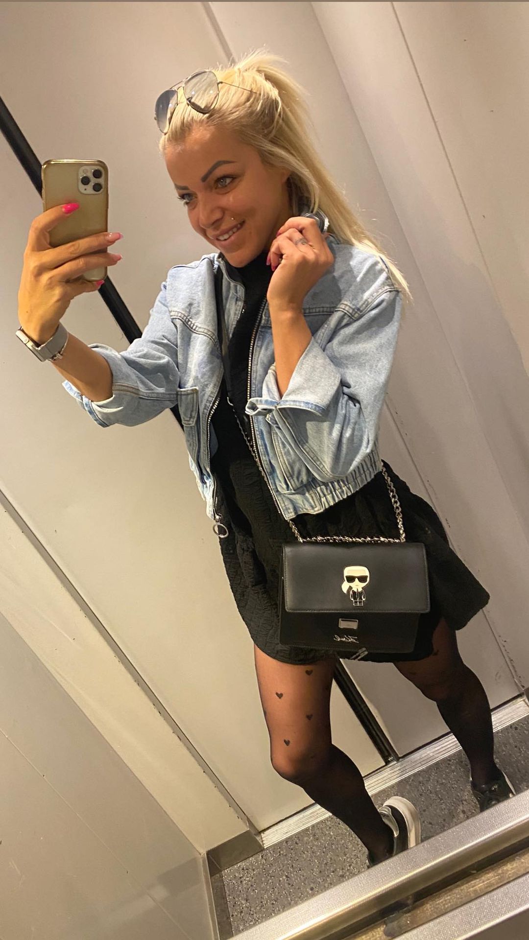 Elevator selfie in black pantyhose 😊