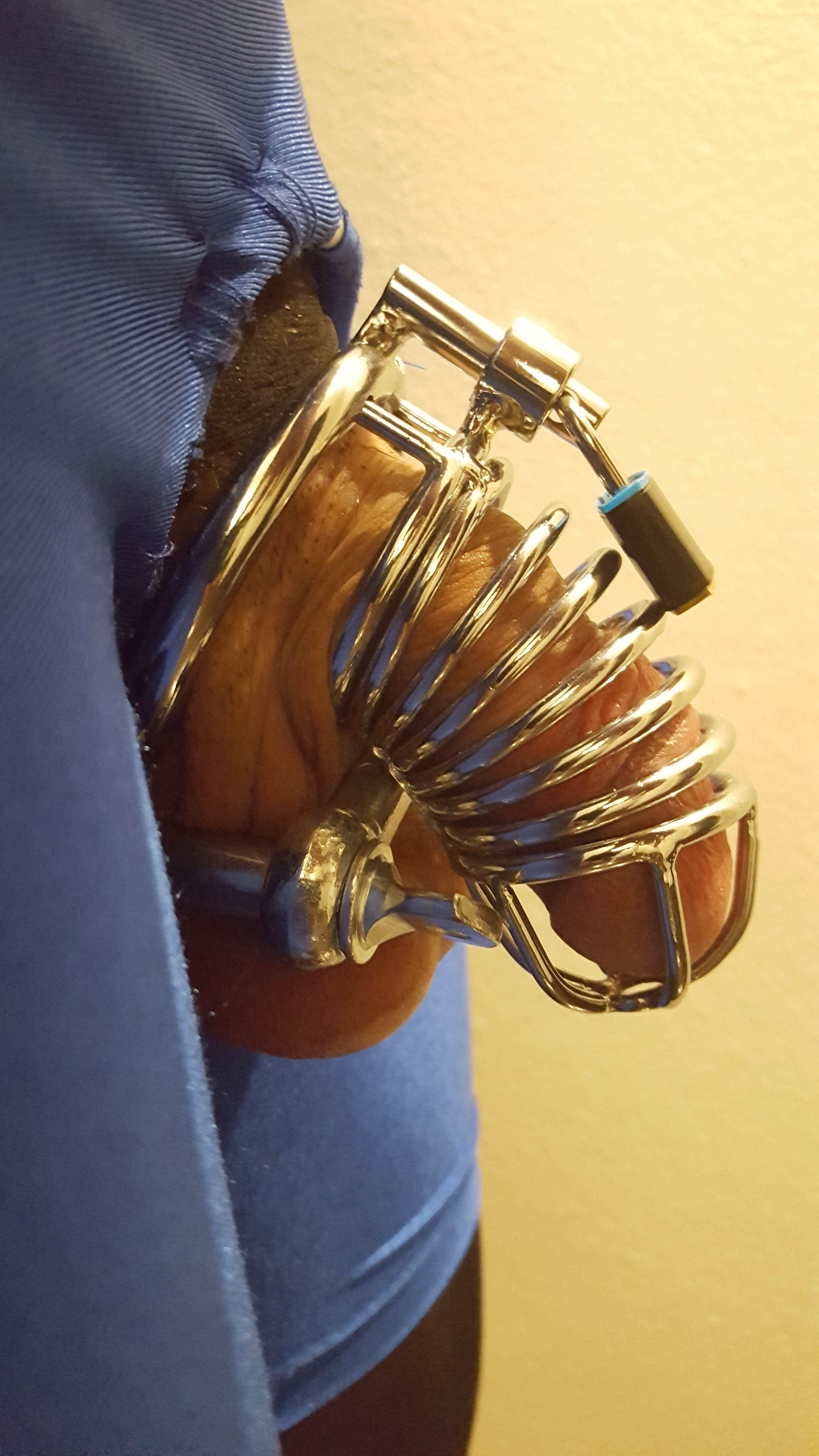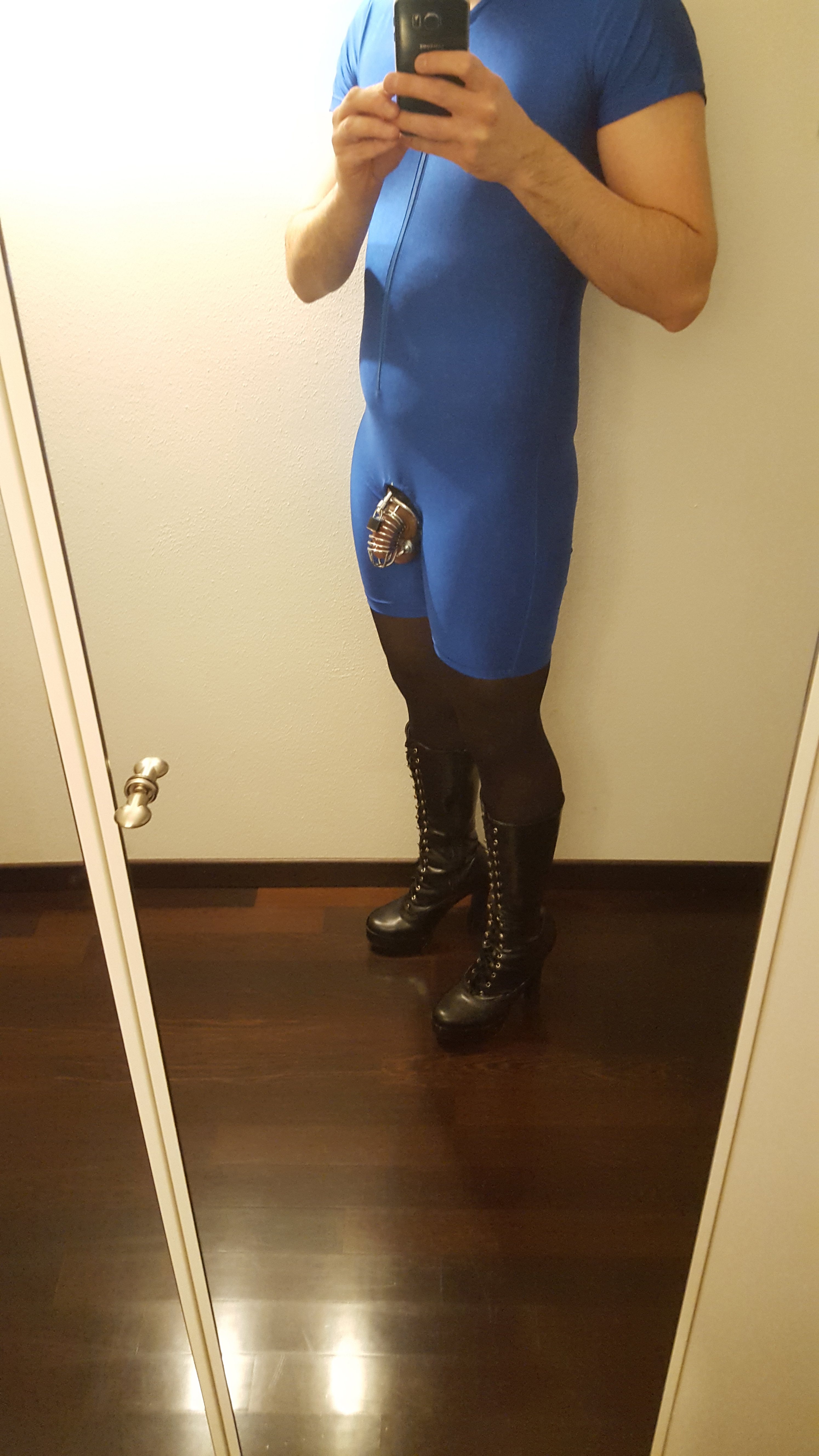 My attire: thick blakc pantyhose ripped at the front and a shiny blue bycicle suit, in which I cut and sew a large opening to expose my genitals. On top I was wearing a steel chastity belt ( I wish it had a penis plug) and a D-shaped shackle as a ball stretcher, the first time I tried it.