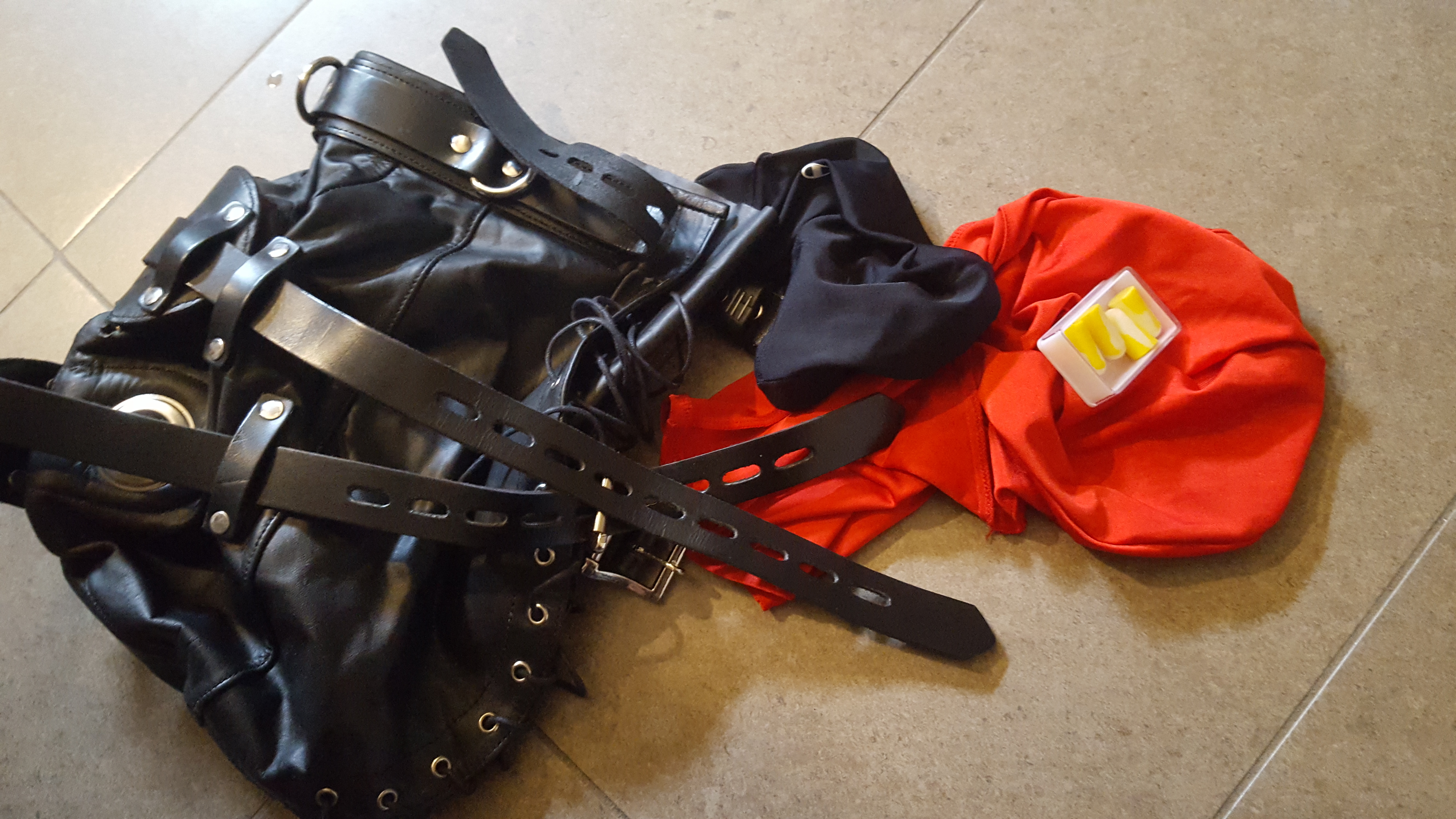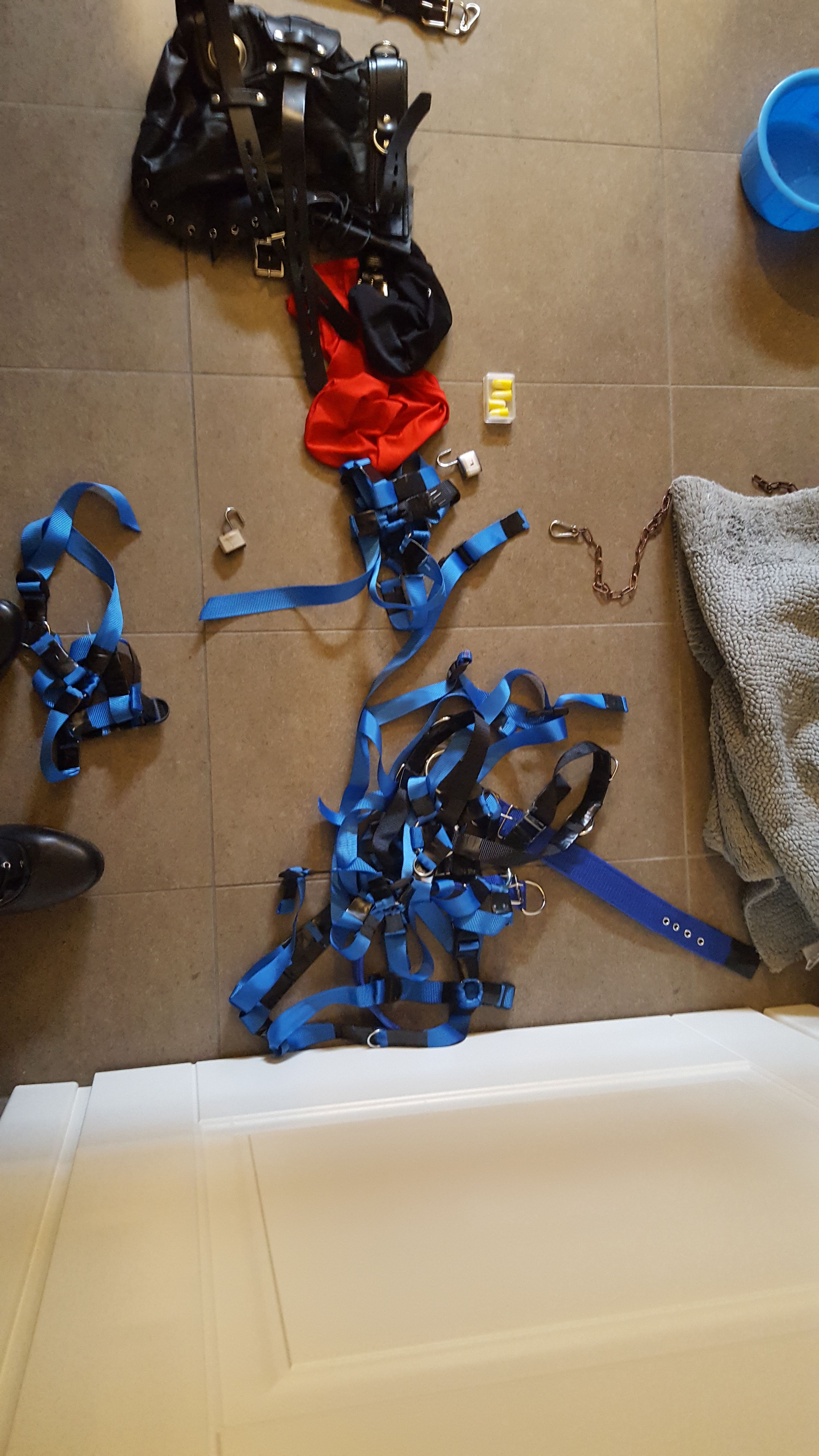 Here is the main bondage tool: my own straight-harness, all tangled up.