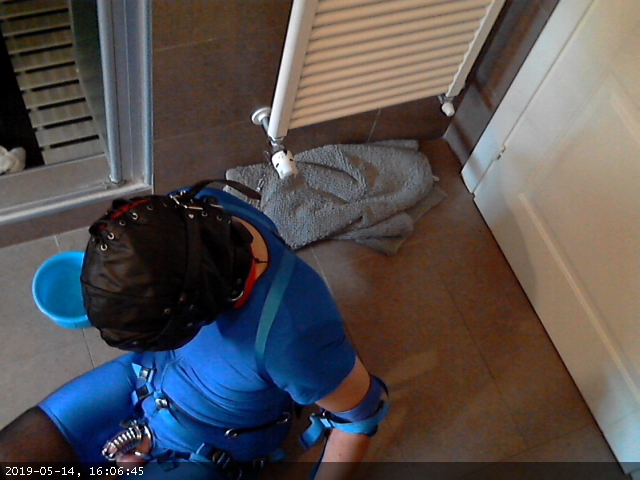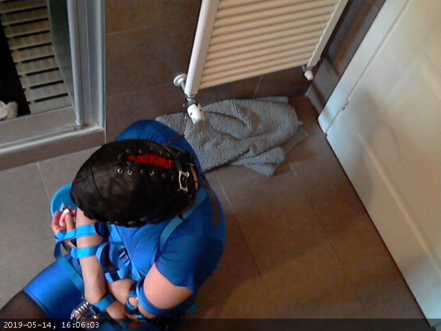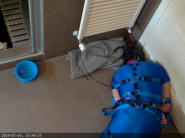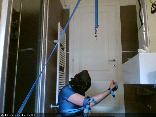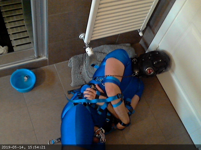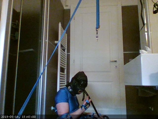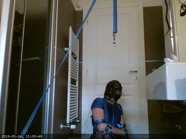 This time I tried a recent addition: instead of using the elbow straps to secure my elbows to the waist loop I devised a pair of shackles (two large dog collars) and two straps pulling the shackles towards a ring at the back of the harness and then looping at the front to press my arms againt my body.