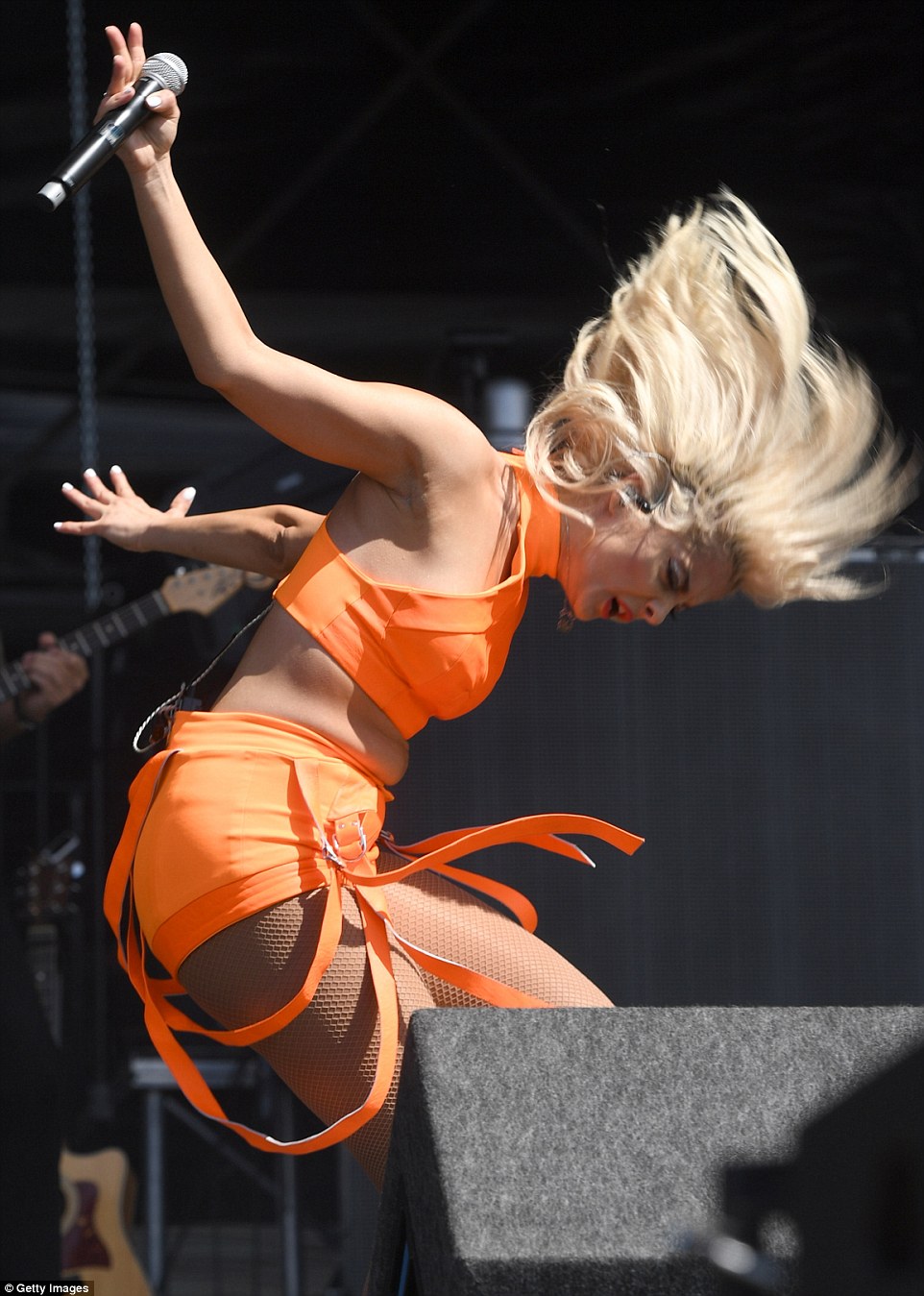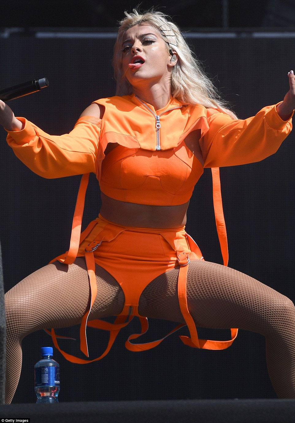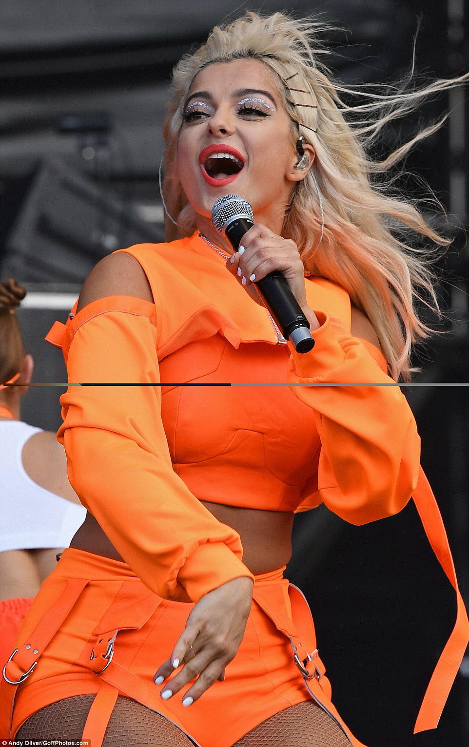 BeBe Rexha in fishnet pantyhose and shorts. Looks like she's got another shiny layer underneath...