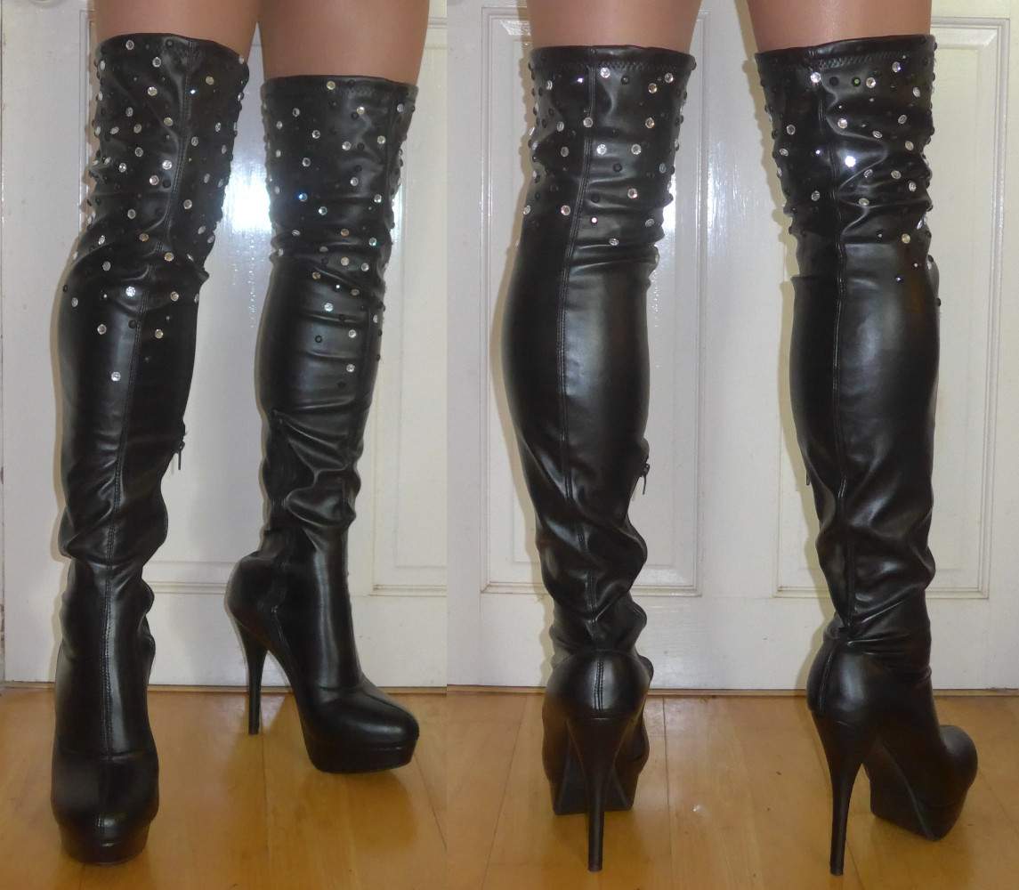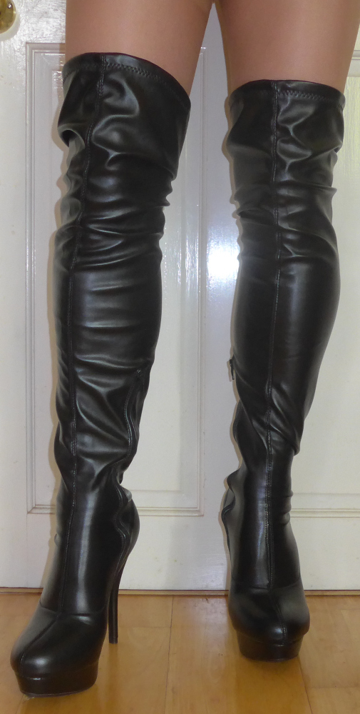 The boots are exactly the over-the-knee right shaft height and are very comfortable, albeit with a very 'chemical' smell. Their platforms make the 14cm heels effectively about 11cm which is about all I can wear for any length of time these days. Nice that the 'retail price' on their box was over twice what I paid too.