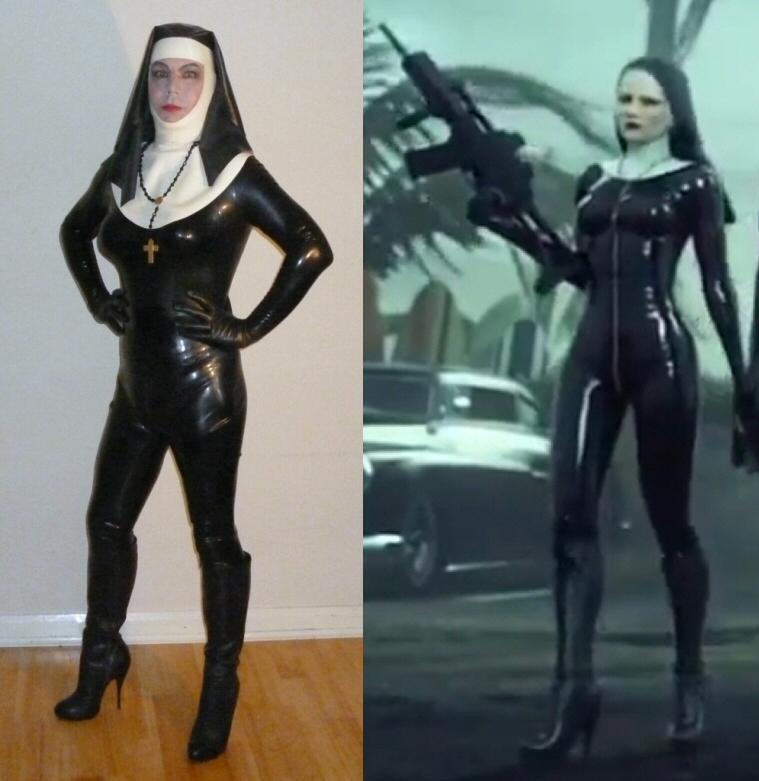 The offending picture (left), me dressed as 'Boo' from 'Hitman: Absolution'. On the right, the original character 'Boo': I posted this pic 'no problem' despite her toting a humungous gun (and the images is also technically copyright, I expect, mea culpa).