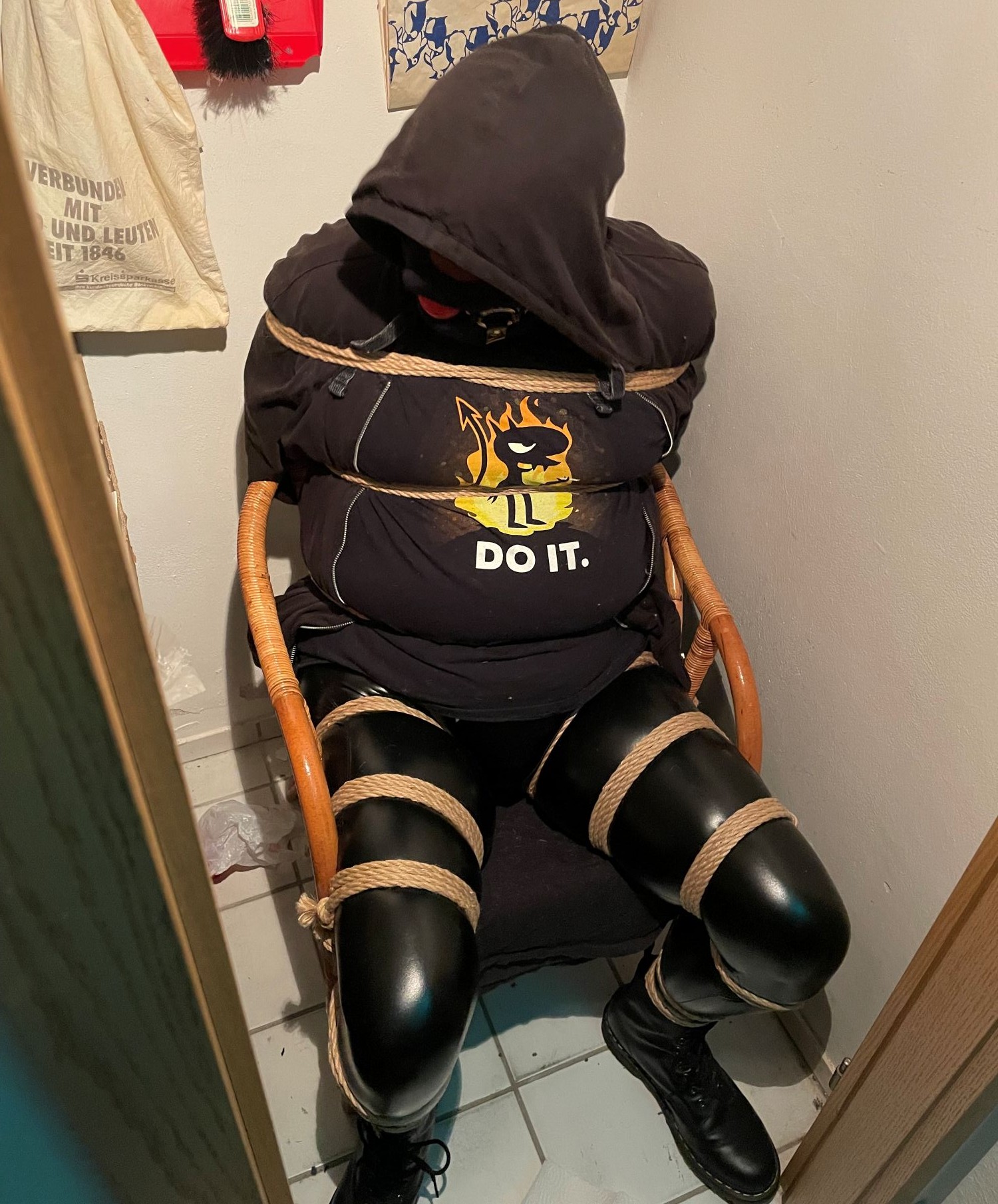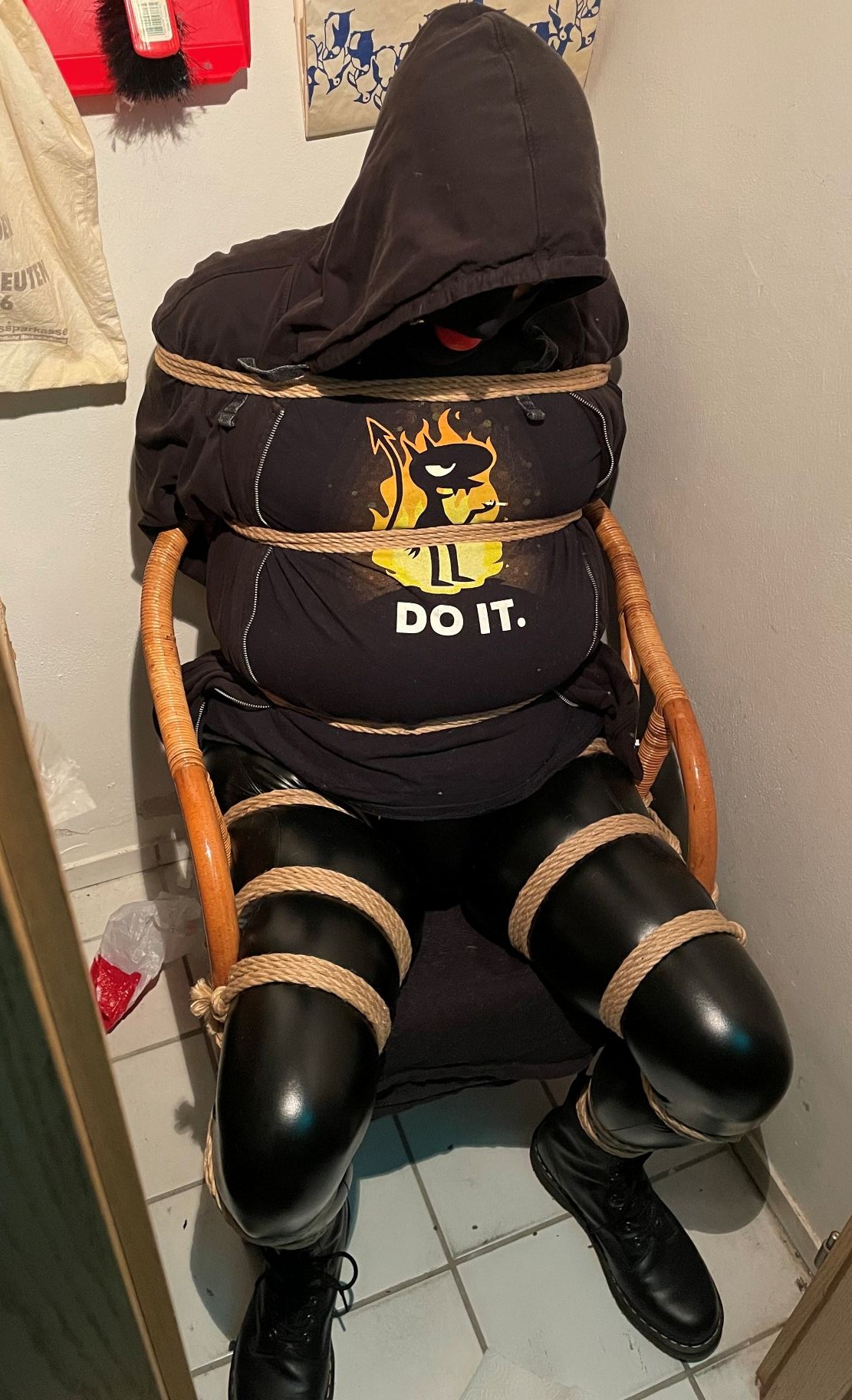 Once everything was clear, I was able to put the plan into action. I had to tie everything up inside the box. I was able to tie the legs with ropes while sitting down, and I was also able to prepare the rope for the hands and connect it to the legs in that position. But from then on, I had to do everything else while lying down in the twisted position, as I would not have been able to close the box once my hands were tied. It quickly became apparent that the winter socks were too risky to use as mittens. Without light and without much feeling in my hands due to the thick fabric, I tangled the rope several times during my attempts. In addition, my hands quickly became extremely sweaty, which reminded me of my worst self-bondage experience (which is also the reason why I don't use handcuffs anymore). So I decided to do without the socks, and without them I was able to wrap the rope around my hands relatively easily. Relatively easily, because I still had no light and couldn't see anything. That's why the wrist bondage ended up looking the way it does. I think my kidnapper probably just thought that more rope was better than proper bondage with less rope. 😁