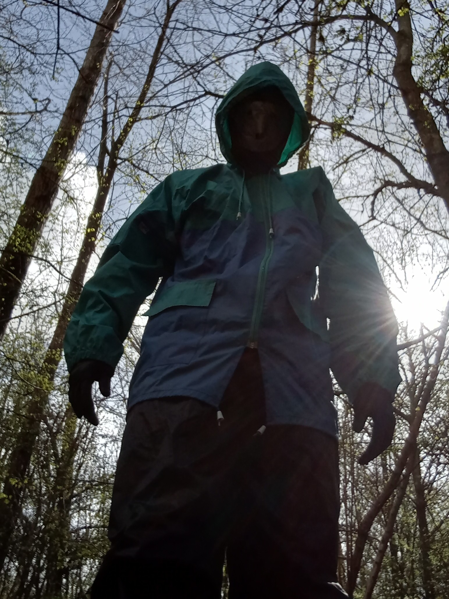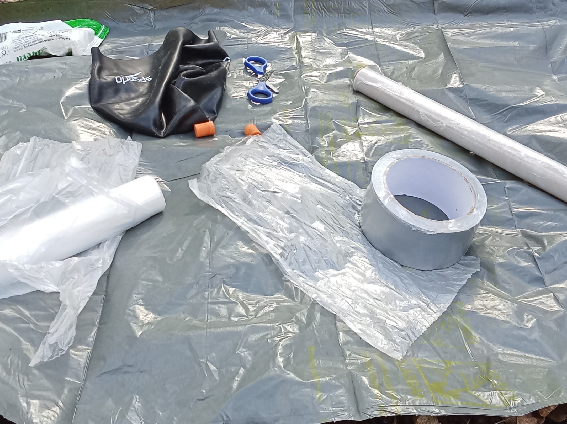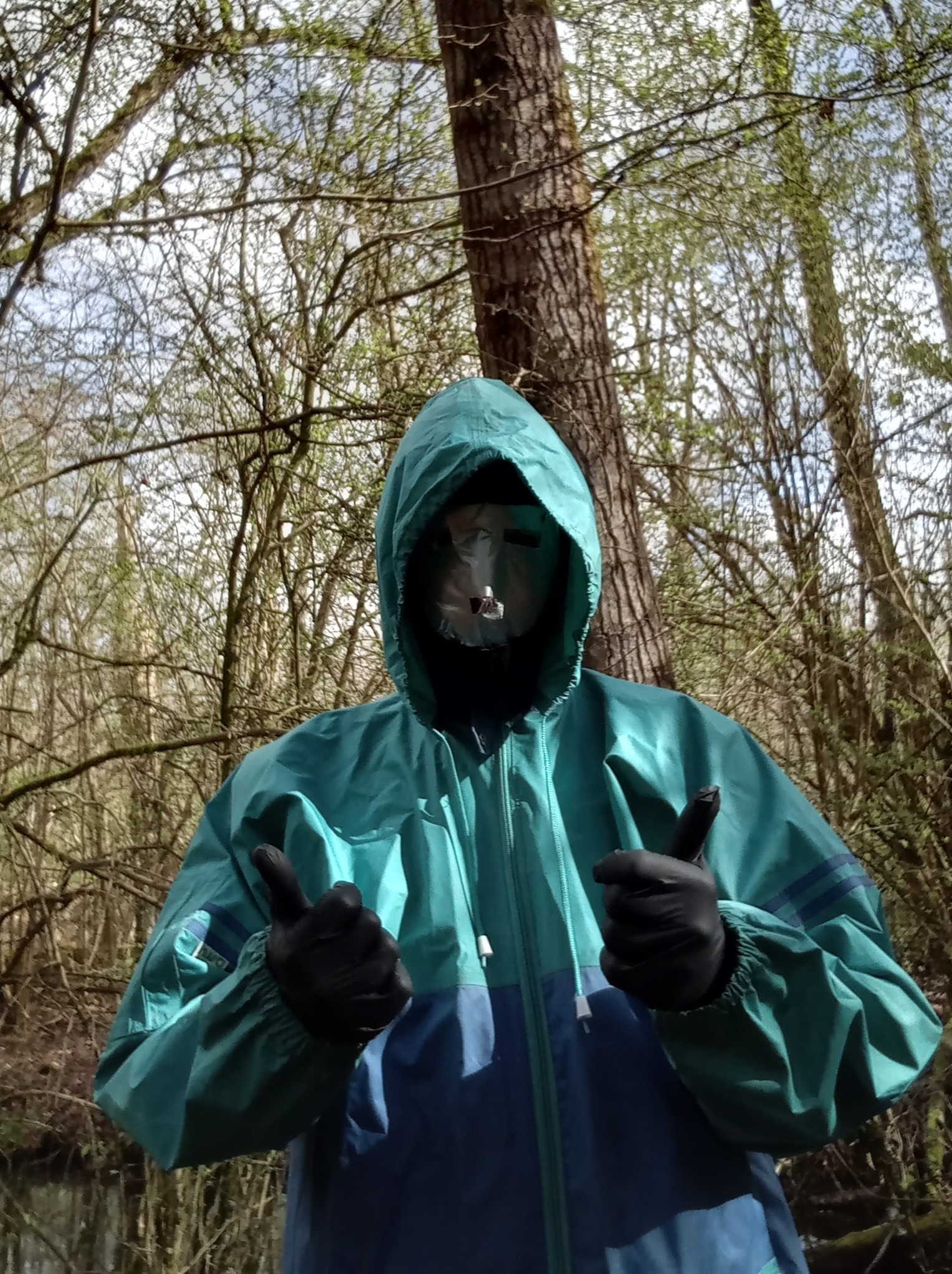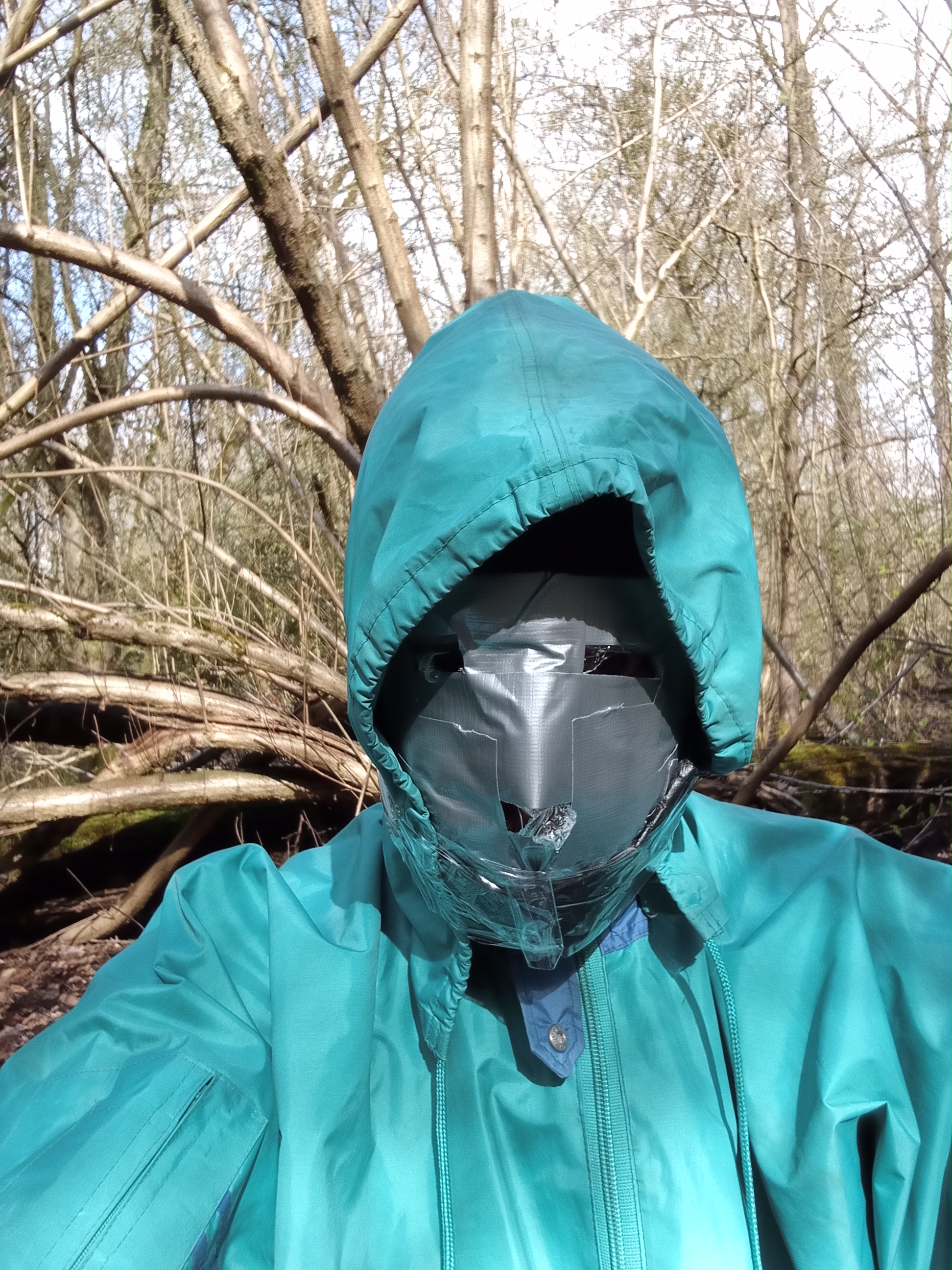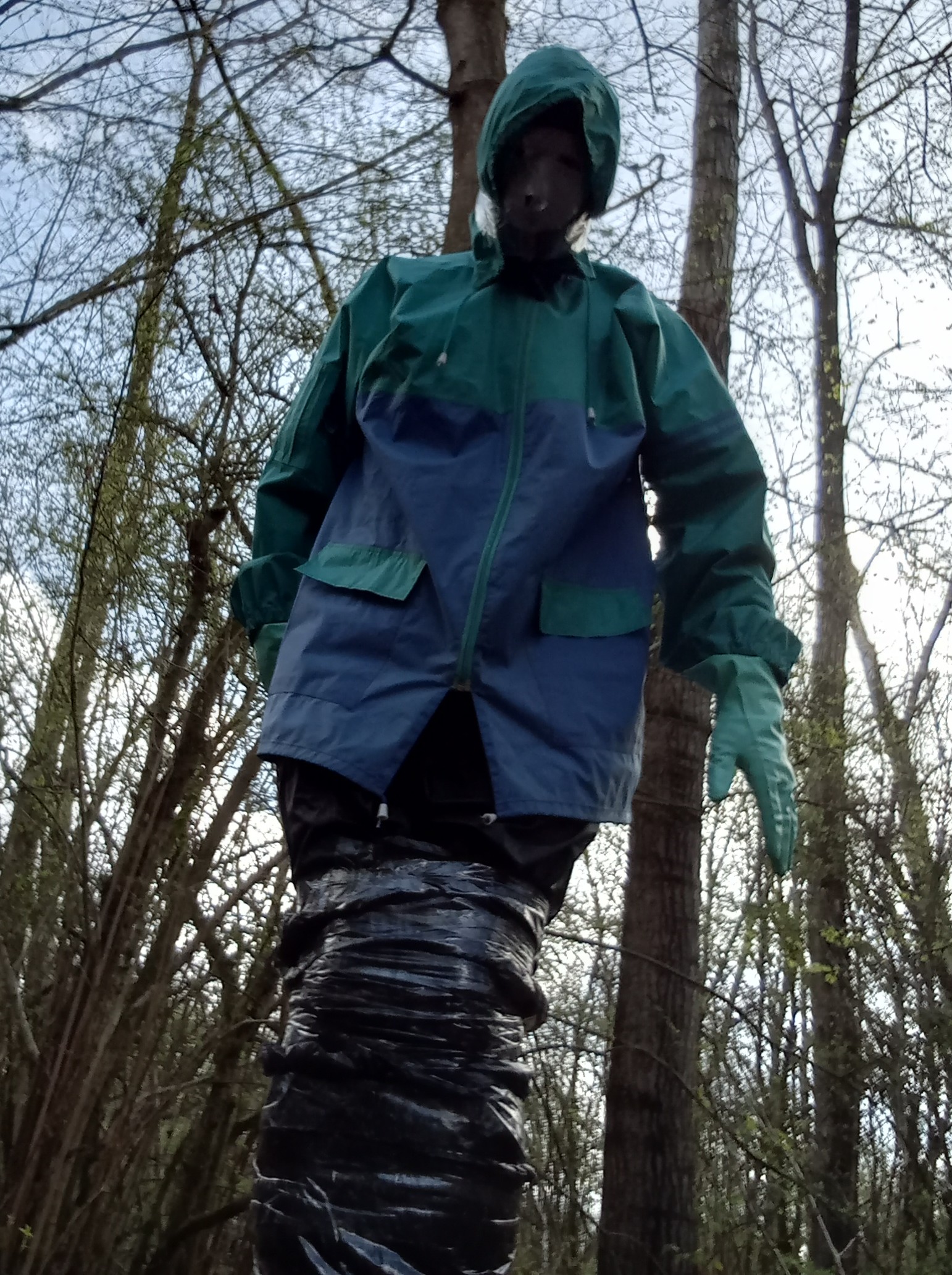 Then, let's cover everything with two layers of cheap 2nd-hand rainwear. As I will be crawling through the forest, these layers will get damaged, keeping my wetsuit whole for another time. I use tape to bind the ankles, collars, wrists and hood of the rainwear in place. Without a set of scissors, getting out of this suit will be hard!