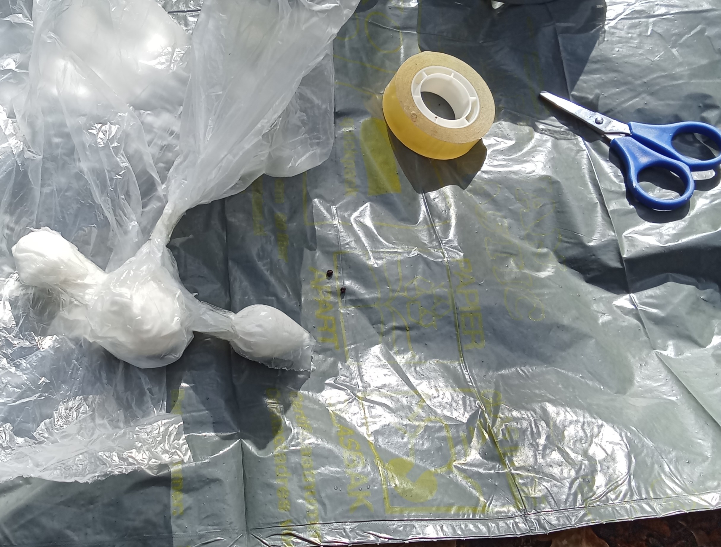 Using a plastic bag, I separated three balls of fabric. (bandages from my first aid kit that were replaced due to being outdated to be exactly). These balls of white fabric were kept in place with circles of tape. A second plastic bag goes over it, so there's three balls of fabric-in-plastic that are losely connected. The whole contraption goes in my mouth, the larger ball in the centre, the two smaller in the cheeks. The end of the bag sticks out of my mouth, so there's no possibility of sliding down my throath. When the duct tape ties my jaw closed, the gag cannot move at all. It feels very restrictive. In the past few years this gag setup has been tried for more than a dozen times before it felt "right" but it a staple of my selfbondage where I use a gag these days.*1