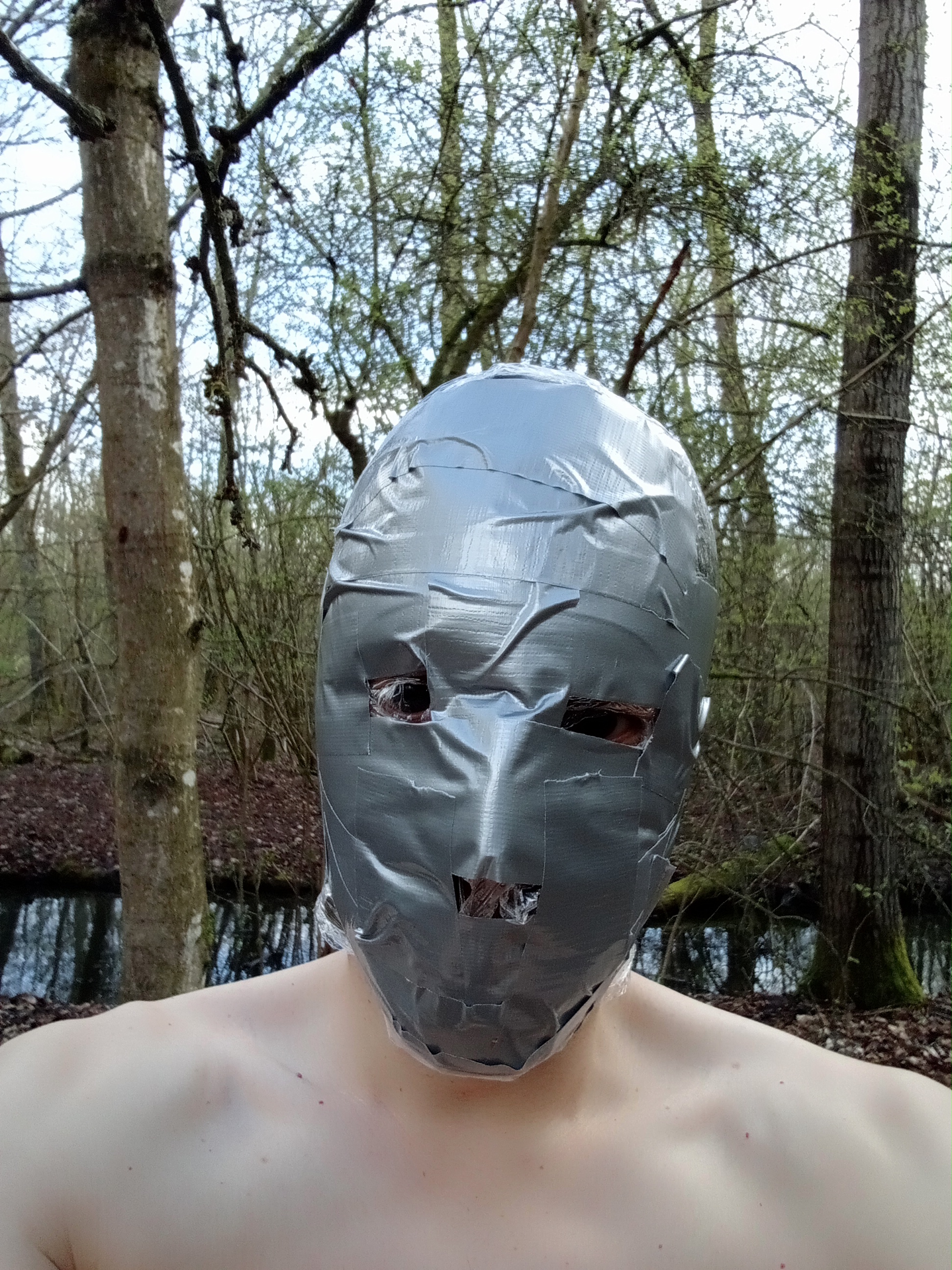 There's something liberating in wearing just a duct tape hood (with gag and ear plugs under it) and a chastity device!