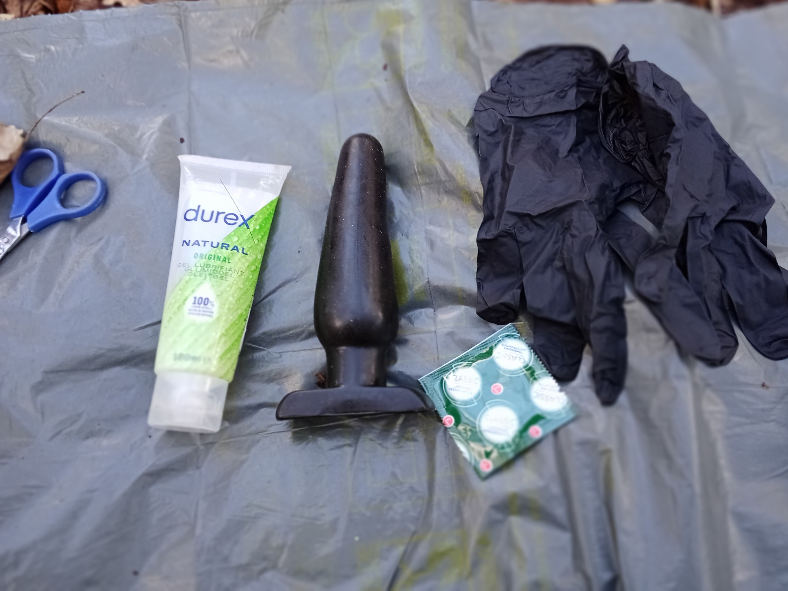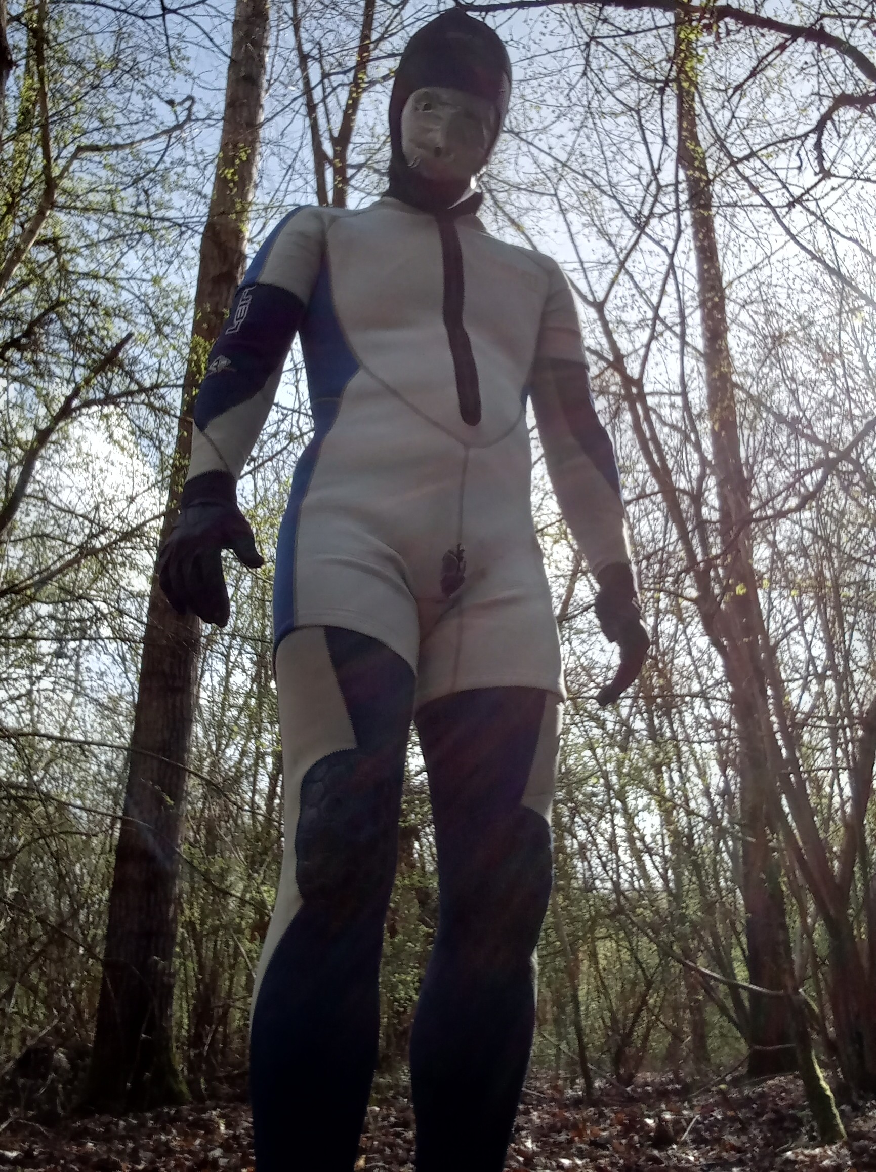Crawling through the vegetation was much harder than I anticipated. Within ten seconds I was out of breath.  As I could breath only through the tiny nose holes, my air intake was far less than I am used to. The heavy gear made it much harder than expected, so I had to slow down. The plug in my arse created all kinds of interesting signals when I snaked through the forest, as did my bound penis which wanted out! Finally, my excessive sweating made everything smooth on the inside, nirvana for those like me who are into layering.