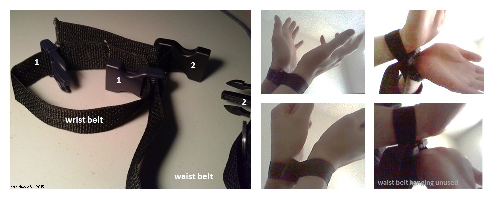 The optional buckle #2, for the adjustable waist belt, is "threaded" according to the usual instructions. To link the waist belt to the wrist strap, use the unused outer hole of the wrist buckle.