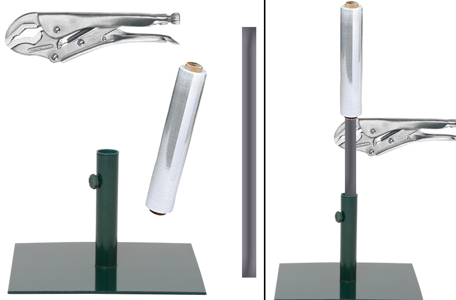 I found a heavy parasol stand in the basement, which could be a nice stand for a roll of clingwrap. It is a simple stone plate with a vertical pipe to accomodate the rod of the parasol. The pipe is wide enough to accomodate the metal pipe of my vacuum cleaner. Put together, I got a vertical pole that is 1.10 m high, this is my stand for the clingwrap-roll. I used locking pliers as a stopper, to keep the roll at the top of this pole.