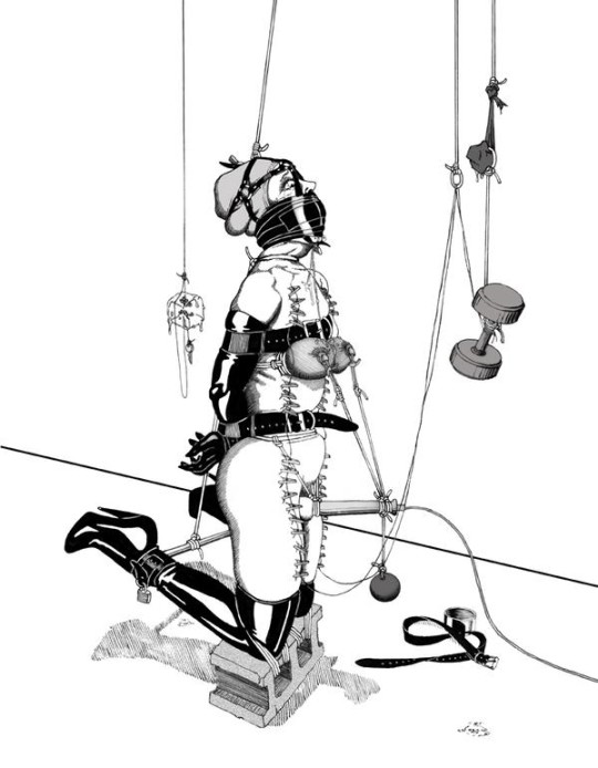 Yes, there is a weird bondage device here ("The lowest bars can swing out downwards to open each cell, but, of course, they are locked."), but look at those legs... High heels... And back-seamed stockings....