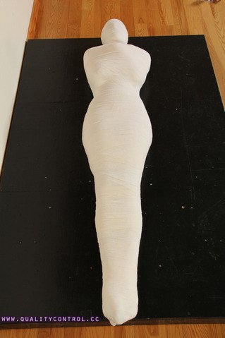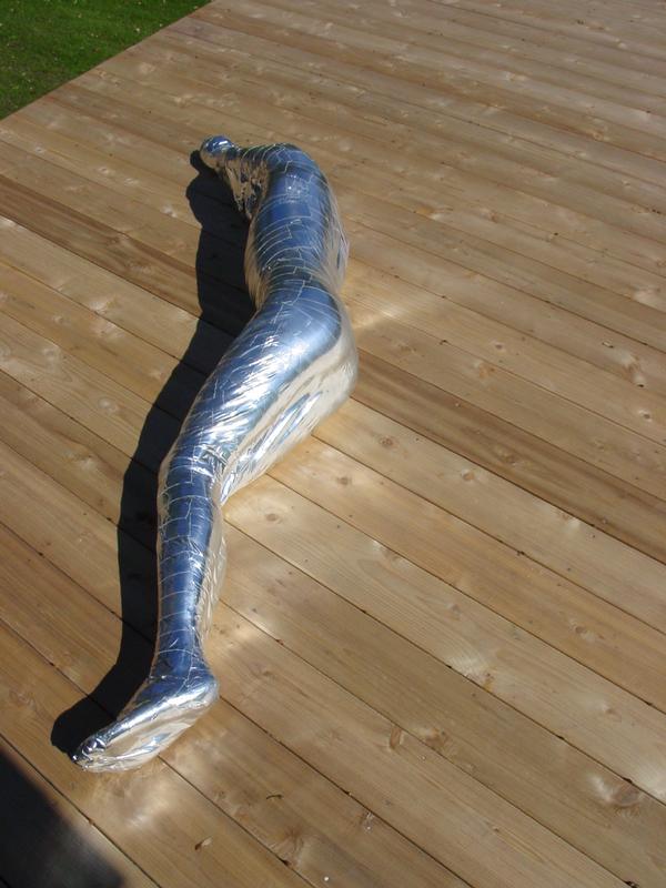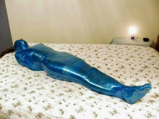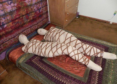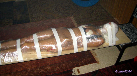 tumblr_nfv9a41QAc1u4z16mo1_540.jpg    - encased then cloth wrapped, what could be better? OK this is better  tumblr_nkk31fP4g81tlluajo1_400.jpg    with complete mummification. Can it be improved? Oh yes,  tumblr_n7hca7lNNu1tb6zhdo3_500.jpg    lets add some rope and another willing victim!