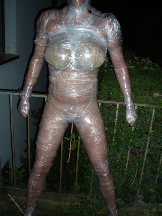 I took some black bin bags and taped two together to make a long tube. I cut holes for head and arms so it ended up being a bit like a tube dress. The. I used some parcel tape that I had got from the warehouse at work to slowly mummify my whole body except my head and arms... went to bed this way and actually fell asleep but woke up an hour or two later in a great big sweaty cocoon. Used scissors to carefully cut myself free, dried off and went back to sleep. Was Still living at home at this stage but didn’t go on a family holiday on that occasion..... no time pressures to clean up before morning.