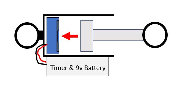 Basically one 30mm 12v E-mag down a bit of plumbing pipe wired to a timer circuit or direct to battery if brave