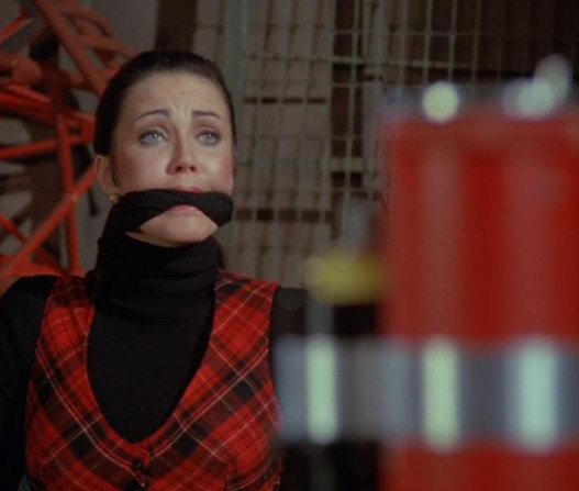 Although Lynda was tied up and cleave-gagged several times in the show, sadly it was never in the blue suit.