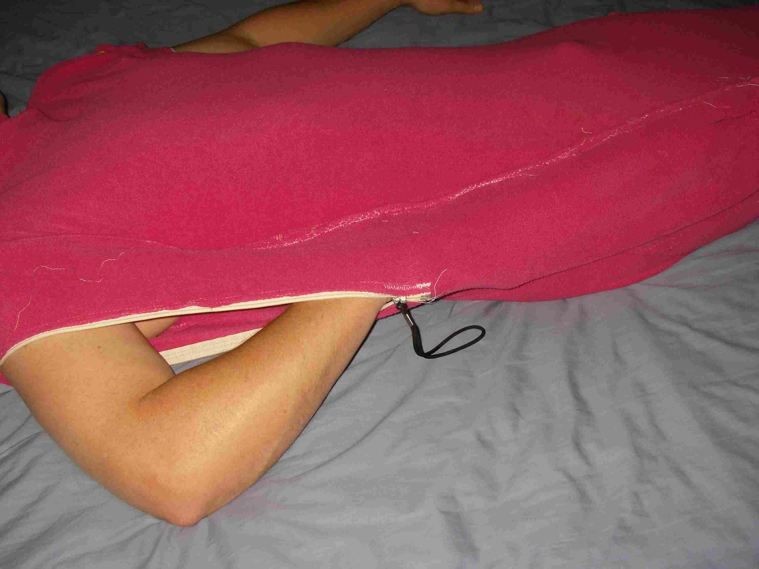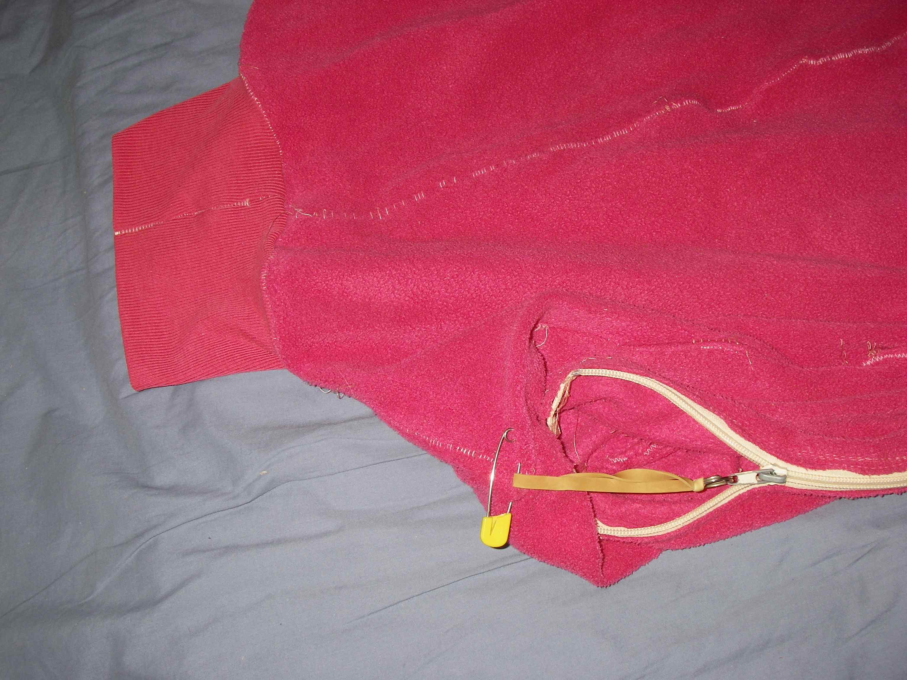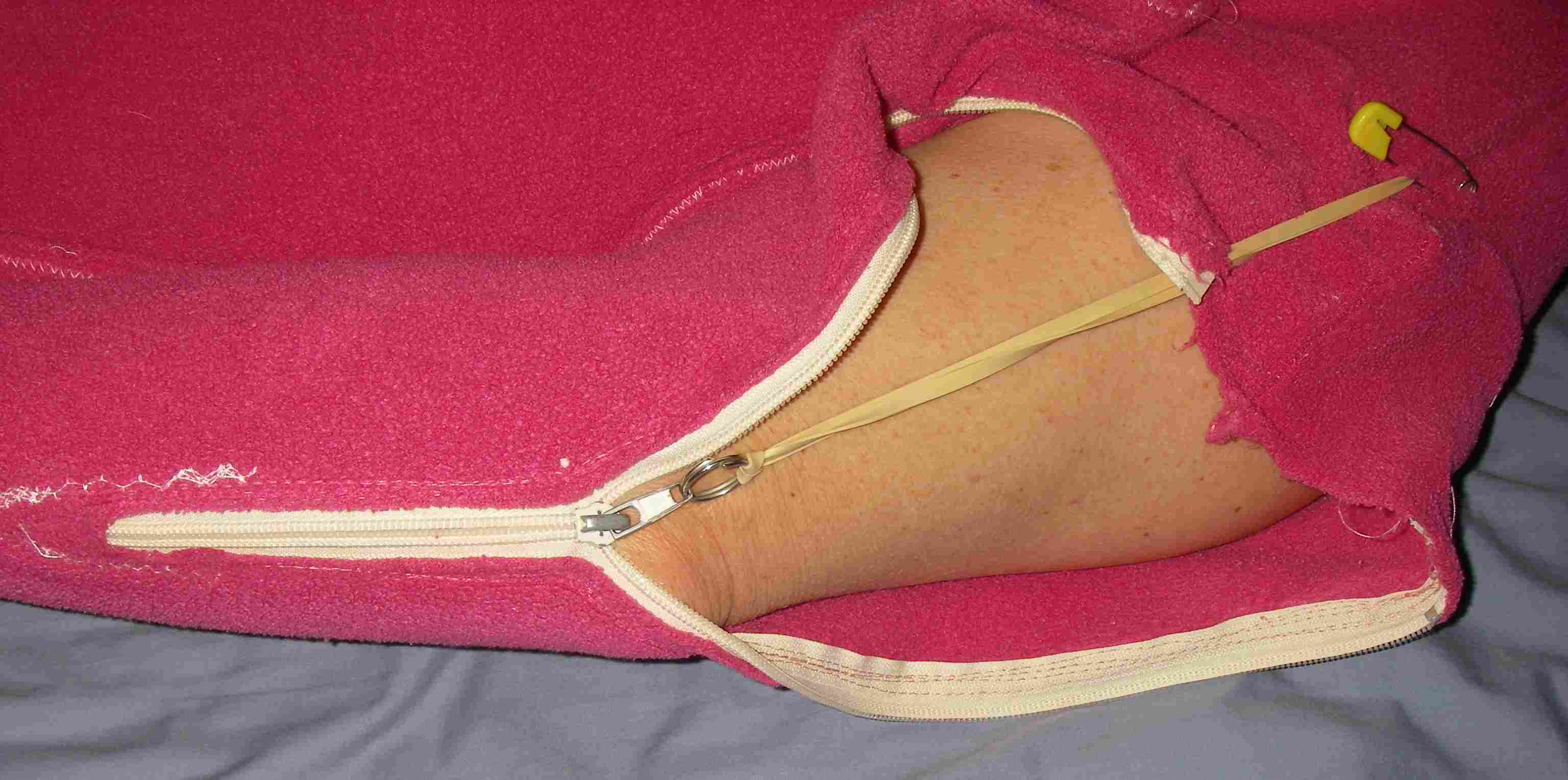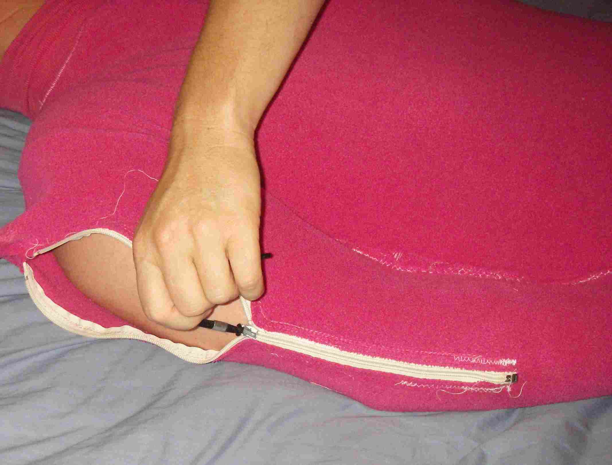 This is the good bit … Zipper sitting at the point of no return over my elbow. Just one more wiggle and ….