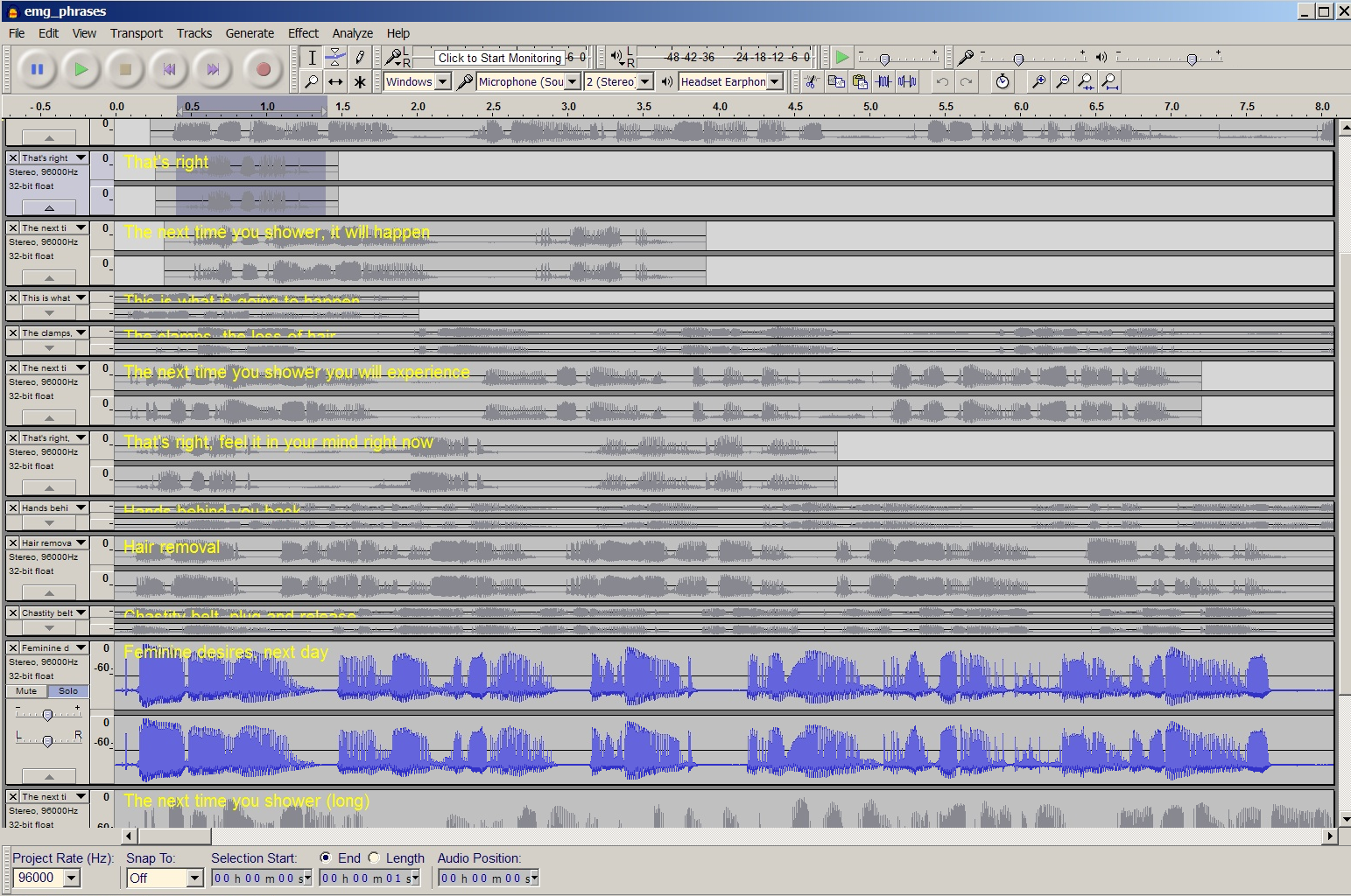 Next ideas is to add some simple "whisper" suggestions into the left and right ears. I can cut out phrases from the main track. But I'm not sure what to put in what ear. Any ideas?