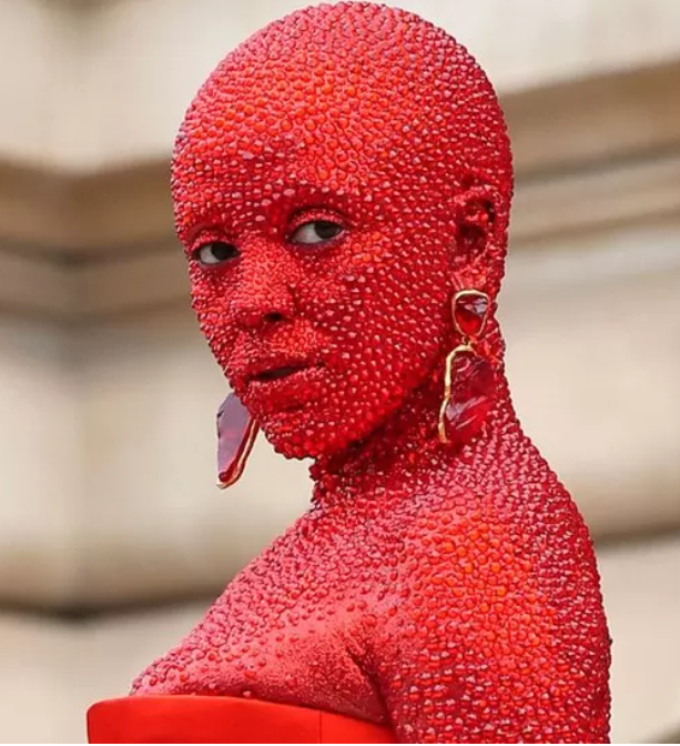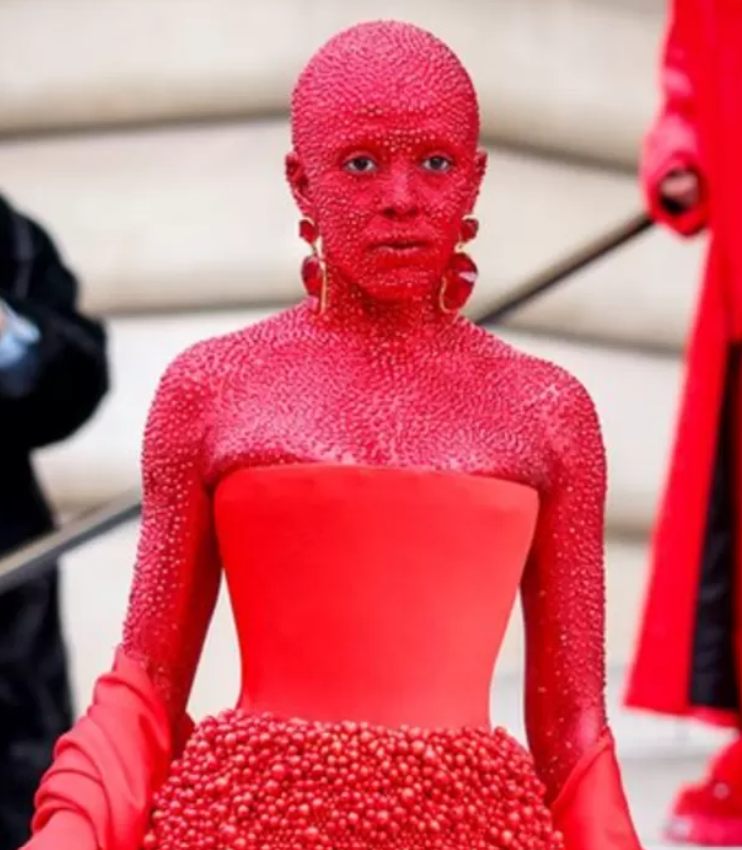 Doja Cat turns heads in red body paint and 30,000 crystals at Schiaparelli's Paris show - BBC News