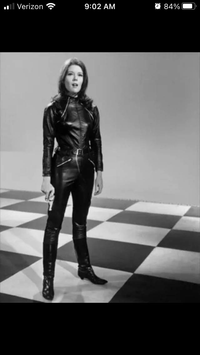Mrs Peel's name was even derived from 'Man Appeal'. There was also a PVC version of the catsuit but iirc she much more commonly wore rather boring fabric versions, her predecessor Cathy Gale was much more reliable for leather.  Later, Tara King wore some interesting boots and Purdey very occasionally wore some lycra too.
