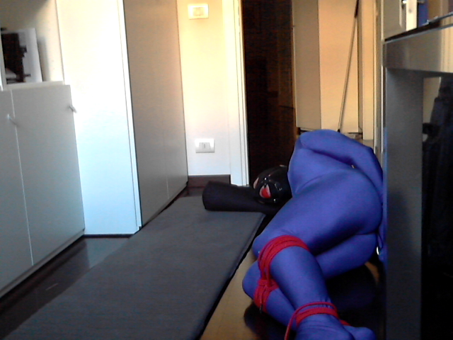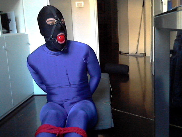 -I was wearing a blue, slightly metallic zentai suit with a separate three-hole spandex hood. Plus, a gorgeous ball-gag harness (quite big!) bought from ozbondage.com