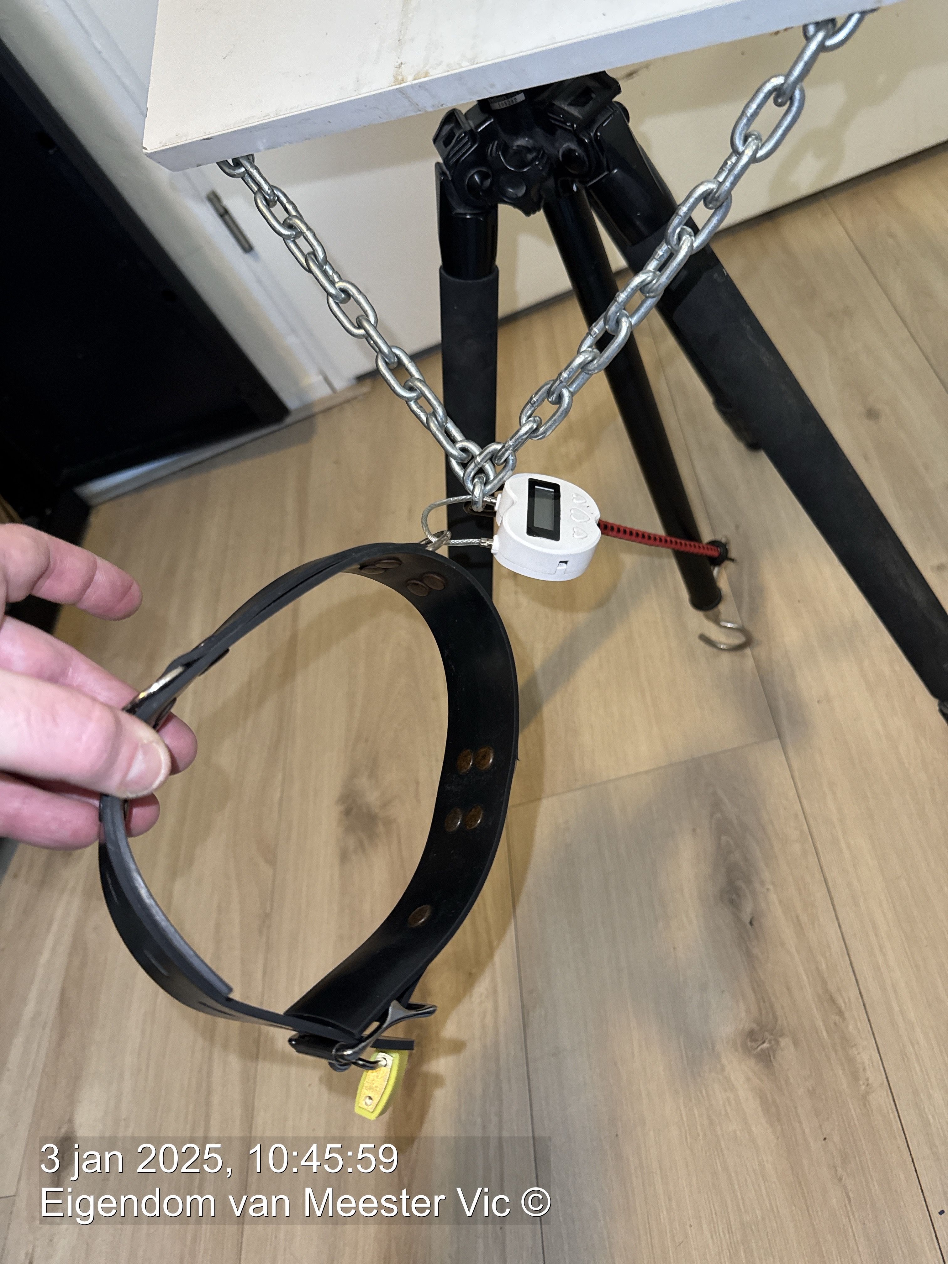 I sit on a kitchen chair and I have a MagBound® Handpillory bolted to the back of it. The handpillory is really great, but when ordering it I made a mistake. I ordered a too small size and had to grind them out, but now they fit my wrists perfectly.