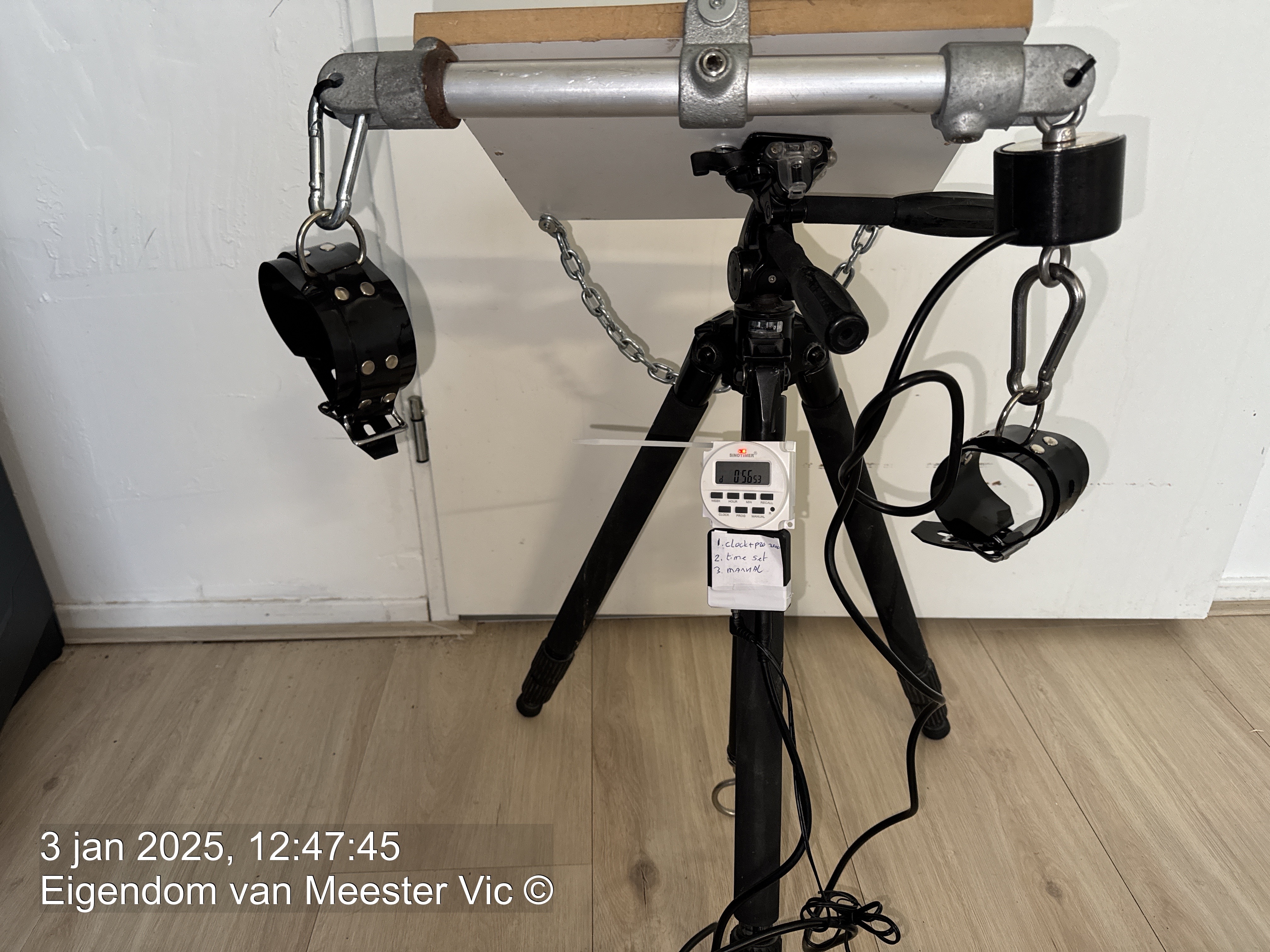 For the piss/cum I have a hollow penis plug which leads to a t-fitting. In front of me, there is an enema bag filled with my first morning piss. Maybe 3dl. On the floor there is a liquid soap pump. There are no batteries in it, it gets the needed voltage and ground from its own timer. 20 seconds every 2 minutes. It has no problem pumping the dildo in my mouth and I have to swallow, or I make a mess.