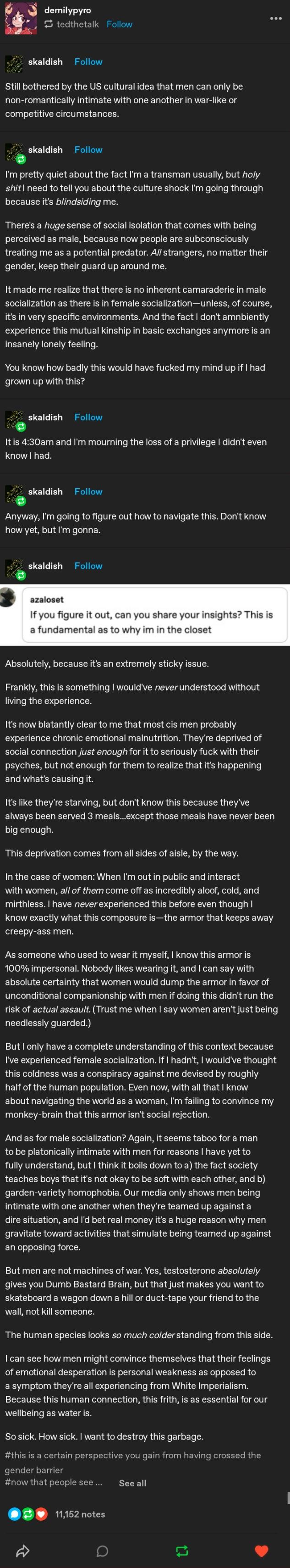 I personally feel that gender dysphoria is biologically caused but likely made far far worse by social norms. I agree with the tumblr posts that men are very often expected to be emotionally borderline dead inside unless for some kind of neo chivalry or romance. There is basically no way for men to be sexualized outside of looking good/muscled and expressing vulnerability or emotions is often frowned upon. Proof of this comes in the form that most statistics of transition ratios show around 65% of transitions are by men, remarkable consider that men often have very weak support networks, and honestly probably more skewed in people who want to but like me can't/don't. A unscientific but interesting point is going on a quick scroll through reddit subreddits for trans and eggirl, far more posts (roughly 12 to 1 as of posting) are transfem rather then transmasc although this is likely skewed as I believe reddit has more men than women however this is ratio is a significant deviation from the average and places it in the same league as videogame/ sport subreddits.