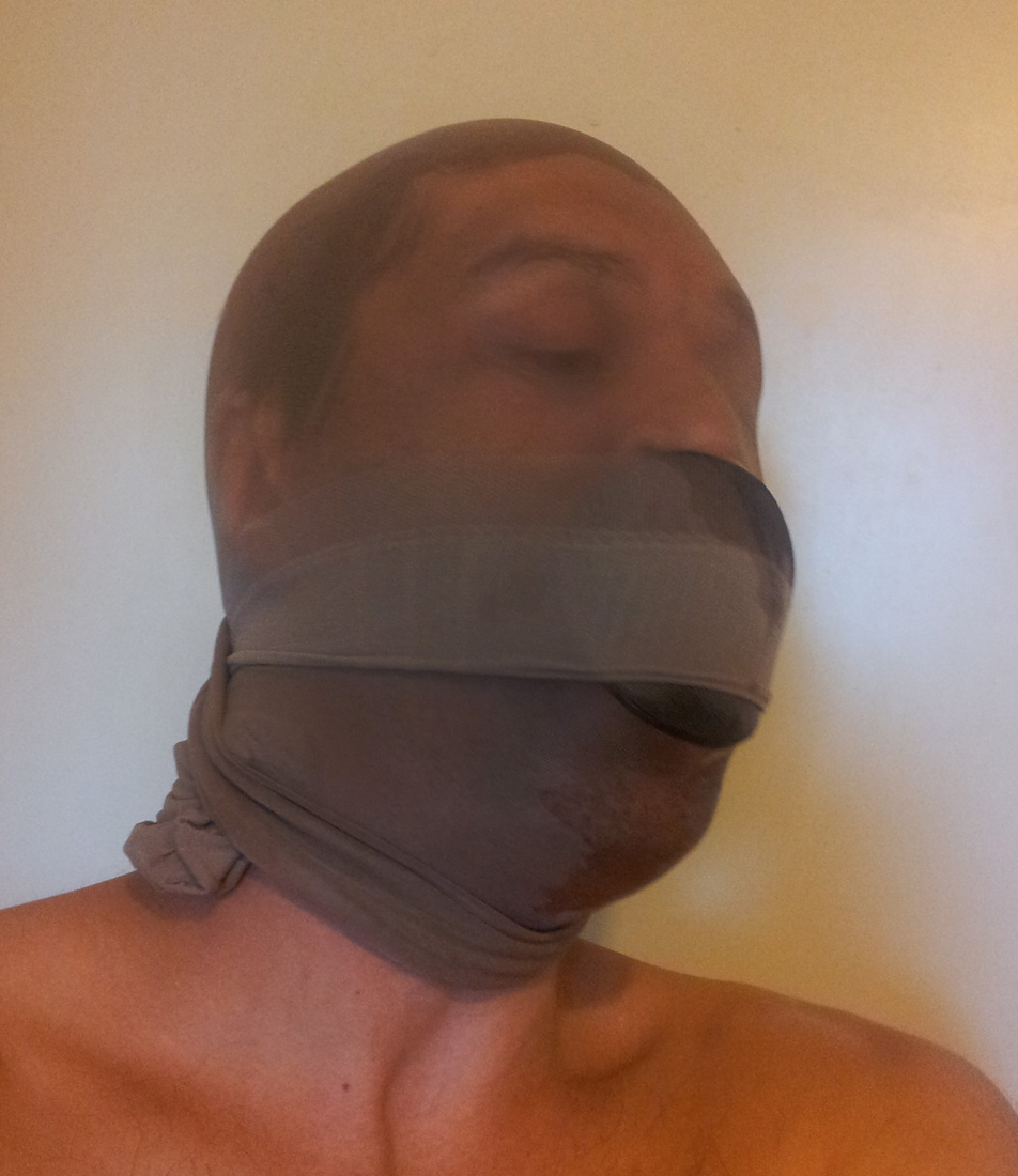 This is the deep-throat training I mentioned - the pantyhose hood pushing that 4x16cm dildo down my throat. Works like a charm ;-P