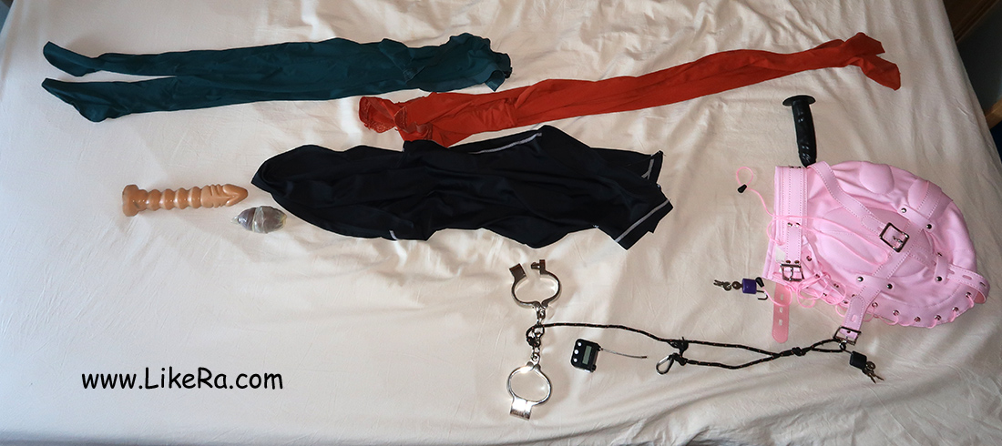 Doyeah pantyhose encasement suit (even here you can see the shine), butt-plug (see the parameters above), 12.5cm dildo gag (a bit thicker and stiffer, than a separate dildo I usually use), leather dogs collar I use as a bondage belt, and a double layer bondage lycra bag.