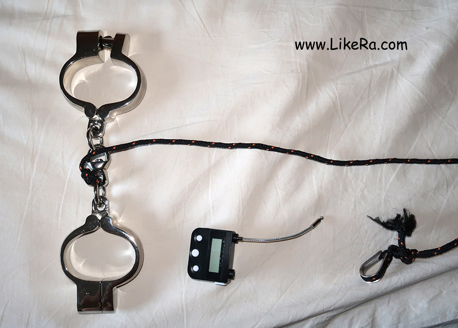 Got the idea? While the time padlock is locked, my hands will be place high up behind my back, pulling the hood (along with the dildo gag) backwards. When the lock is open there will be more freedom, but it will not be possible to simply step over the handcuffs and bring the hand to the front and get the key. The hood is locked with another padlock on the collar.