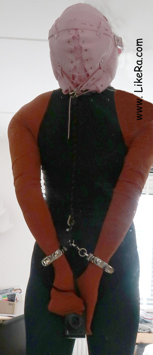 The handcuffs are now locked to the blindfold buckle of the hood behind the back, not in front: