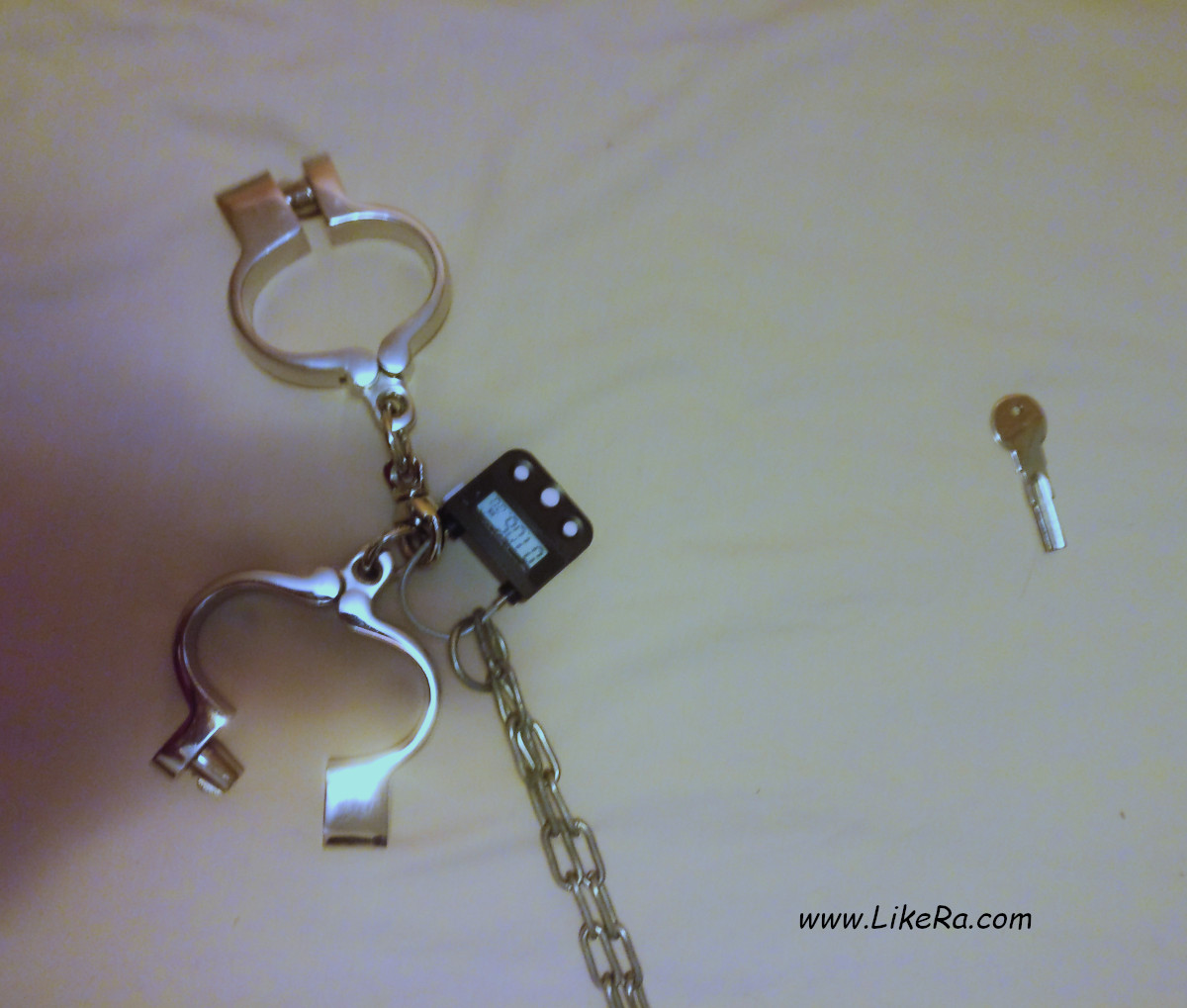 This time one end of the chain was connected to a bed leg (as before), but the other end was tightly looped around my waist and locked with a time-lock set to 1h30min. The hand-cuffs were hung on the chain at eh small of my back.